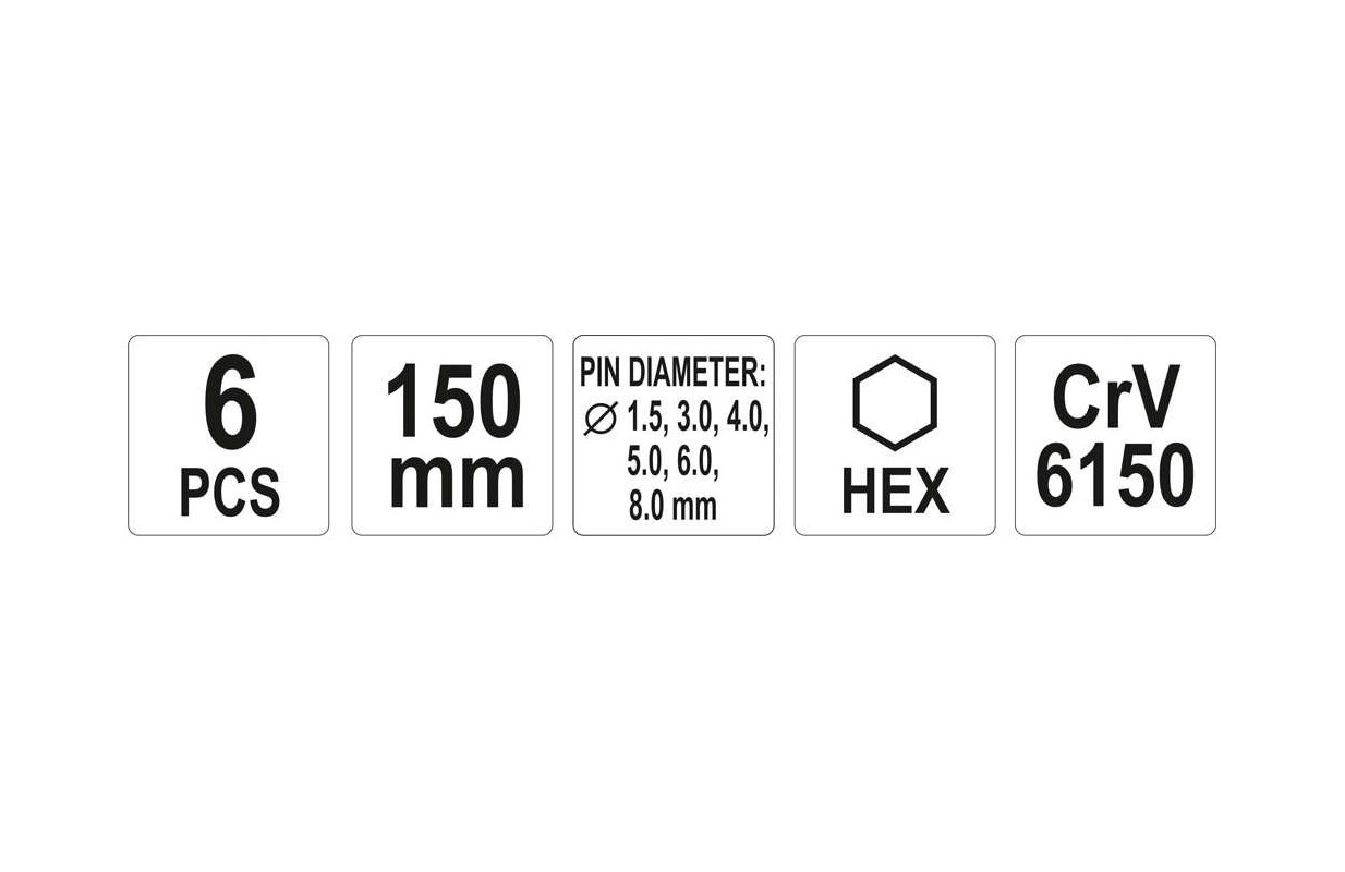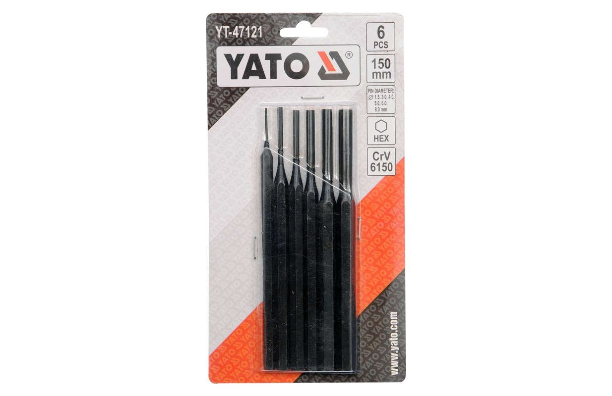 В комплект входят шесть прецизионных пуансонов размерами 1,5х150 мм, 3х150 мм, 4х150 мм, 5х150 мм, 6х150 мм и 8х150 мм. Пуансоны из стали CrV 6150 с шестигранным стержнем. Почерневшая поверхность инструмента. Набор упакован в пластиковый контейнер.