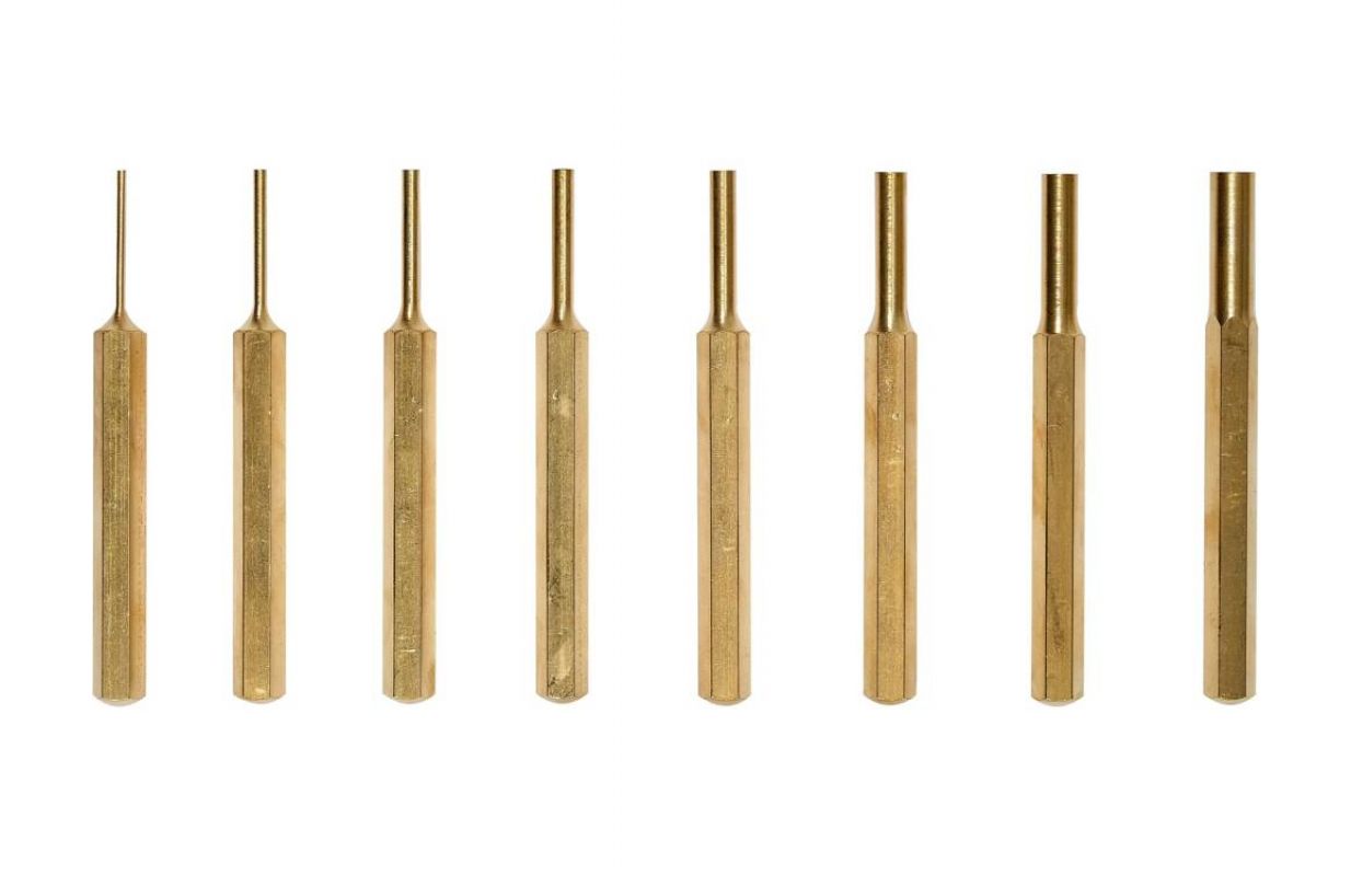 Набор из 8 латунных пуансонов, выточенных из шестигранного профильного стержня. Упакован в чехол с Velcro.