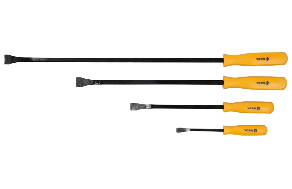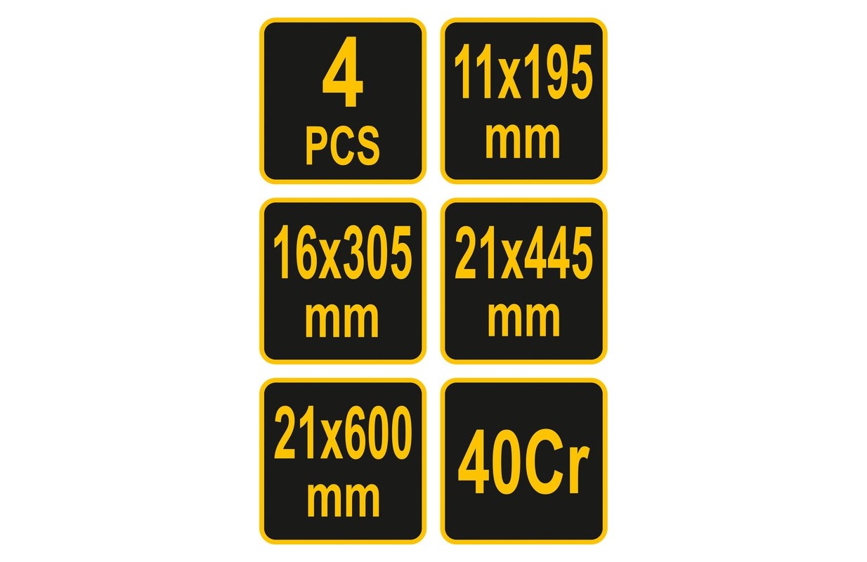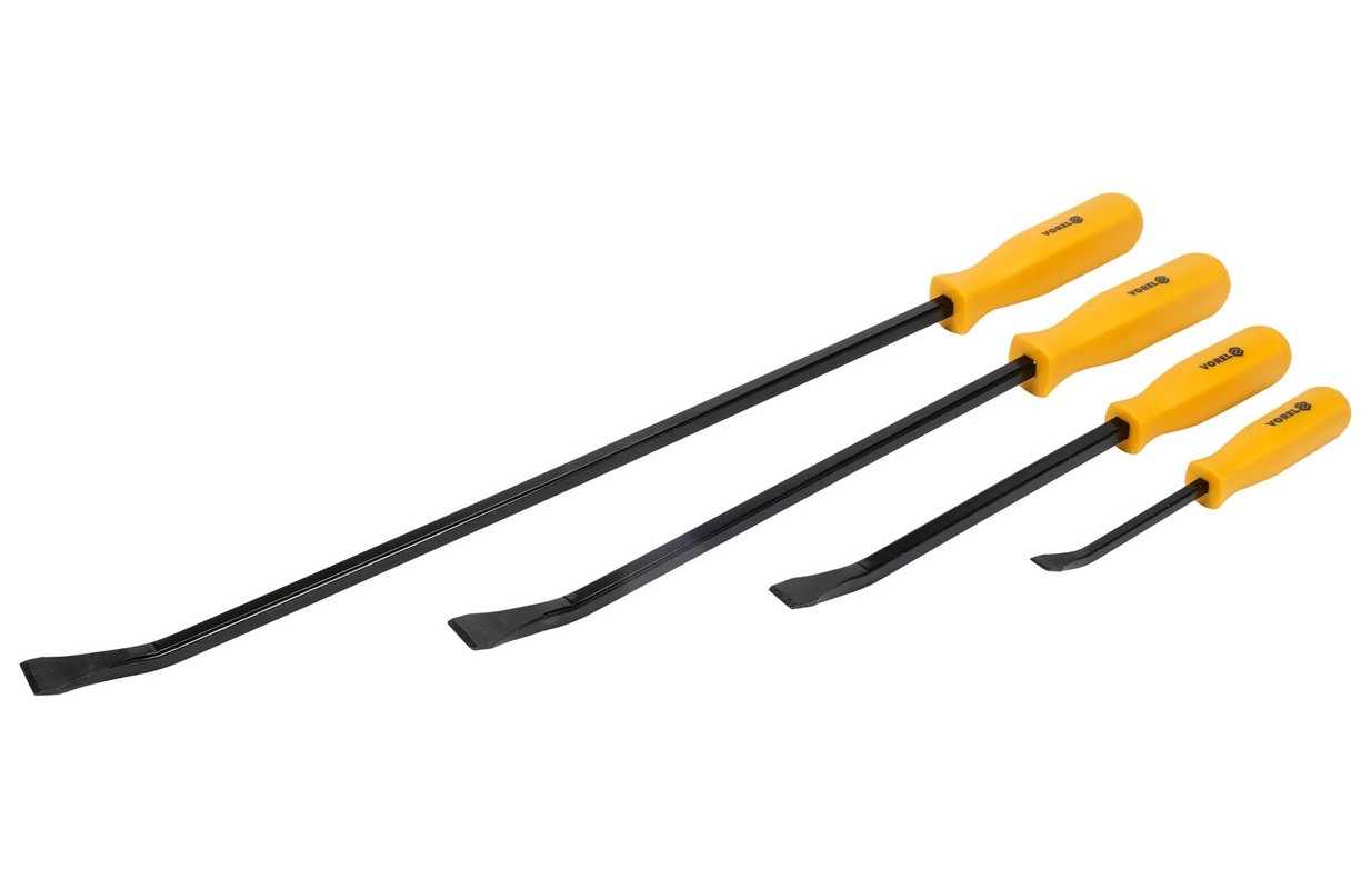 Ломы изготовлены из стали 40Cr, используются для разборки, отжима, сгибания или сборки. Рукоятки покрыты прочным пластиком для обеспечения надежного захвата. Они имеют загнутую верхнюю часть, которая обеспечивает дополнительную точку опоры для работы в узких местах, а заостренные концы легко входят между соединяемыми элементами. В набор входят: ломик длиной 195 мм, ширина лезвия 11 мм