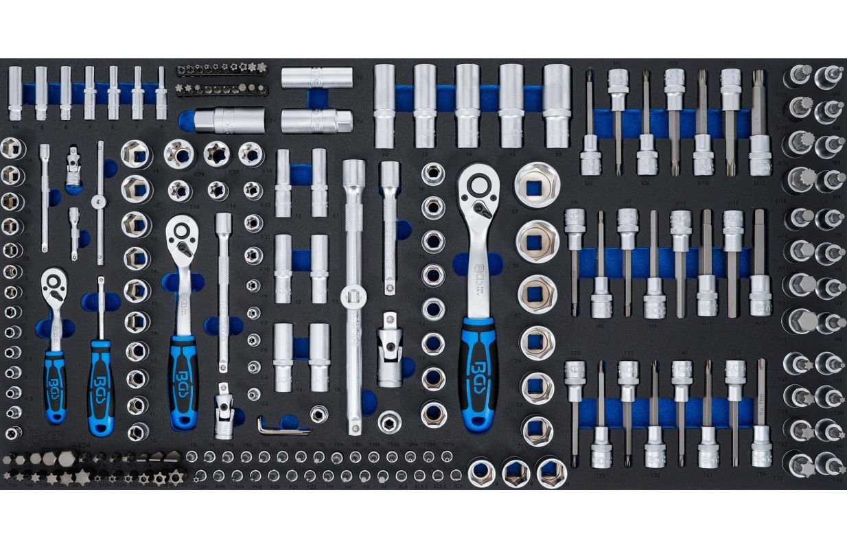 Описание Обширное оборудование для требовательных механиков, а также мастеров с шестигранными головками в коротком и глубоком исполнении, E-типа, а также битовыми головками и битами с различными профилями вывода Высококачественные реверсивные трещотки с мелкими зубьями с 72 зубьями, вставным реверсивным рычагом, эргономичной двухкомпонентной рукояткой и быстросъемной кнопкой для быстрой смены инструмента Содержит, среди прочего, различные элементы управления, такие как удлинители, вращающаяся ручка, скользящая ручка и универсальные шарниры для различных применений по завинчиванию, даже в труднодоступных местах Лоток для инструментов из высокопрочной пены Инструменты защищены в лотке из твердого пенопласта и уложены в углубления нескользящим образом Каждому отдельному инструменту отведено свое место Четкое расположение различных головок, битовых головок и бит для быстрого поиска необходимого размера с накаткой Головки, удлинители, реверсивные трещотки, карданные шарниры, адаптер бит и вращающаяся рукоятка из хромованадиевой стали Отделка поверхности: сатинированная хромированная головки и биты из высококачественной хромованадиевой стали (S2) подходит для тележки для мастерской XL | 7 ящиков | пустой (BGS 4205) Профиль привода: внутренний квадрат Размер профиля привода, метрический: 6,3 мм / 10 мм / 12,5 мм Размер профиля привода, дюймы: 1/4" / 3/8" / 1/2" Количество зубьев в головке трещотки: 72 Тип ручки: 2-компонентная ручка Комплект поставки: