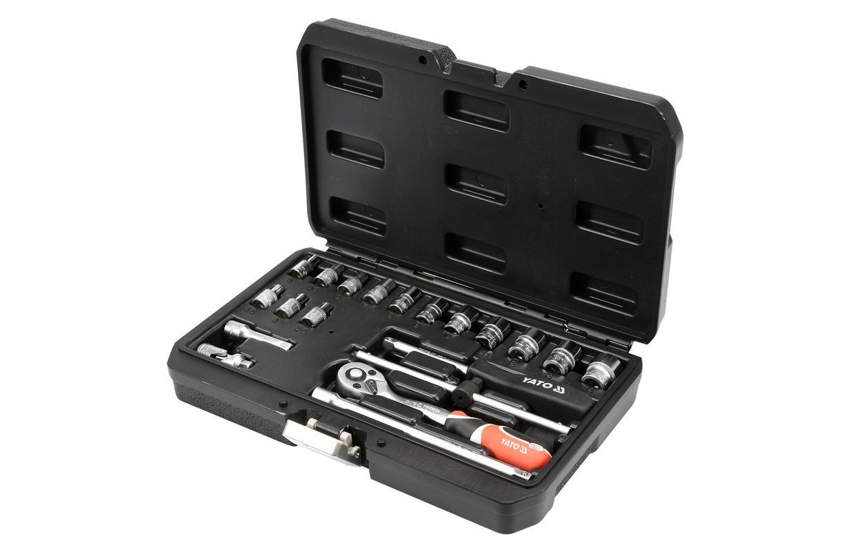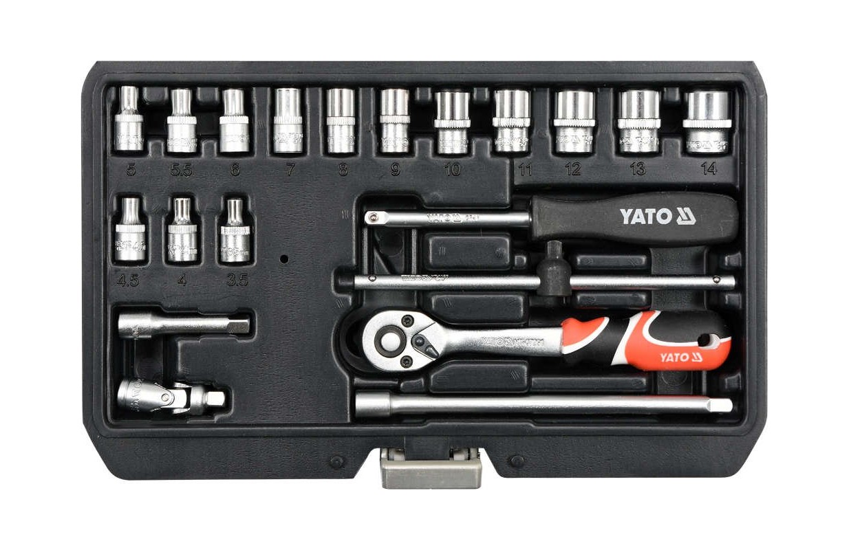 Набор инструментов профессионального качества от Yato, рекомендуемый для сервисов и мастерских. Торцевые ключи и привод торцевых головок изготовлены из прочной хромованадиевой инструментальной стали CrV 50BV30. Головки оснащены системой AS-Drive, увеличивающей максимальный крутящий момент на 25%, с полной защитой обода гаек, головки с двухцветной отделкой поверхности. Трещотка имеет трехкомпонентную рукоятку и 72 зубца (рабочий ход 5 градусов).
