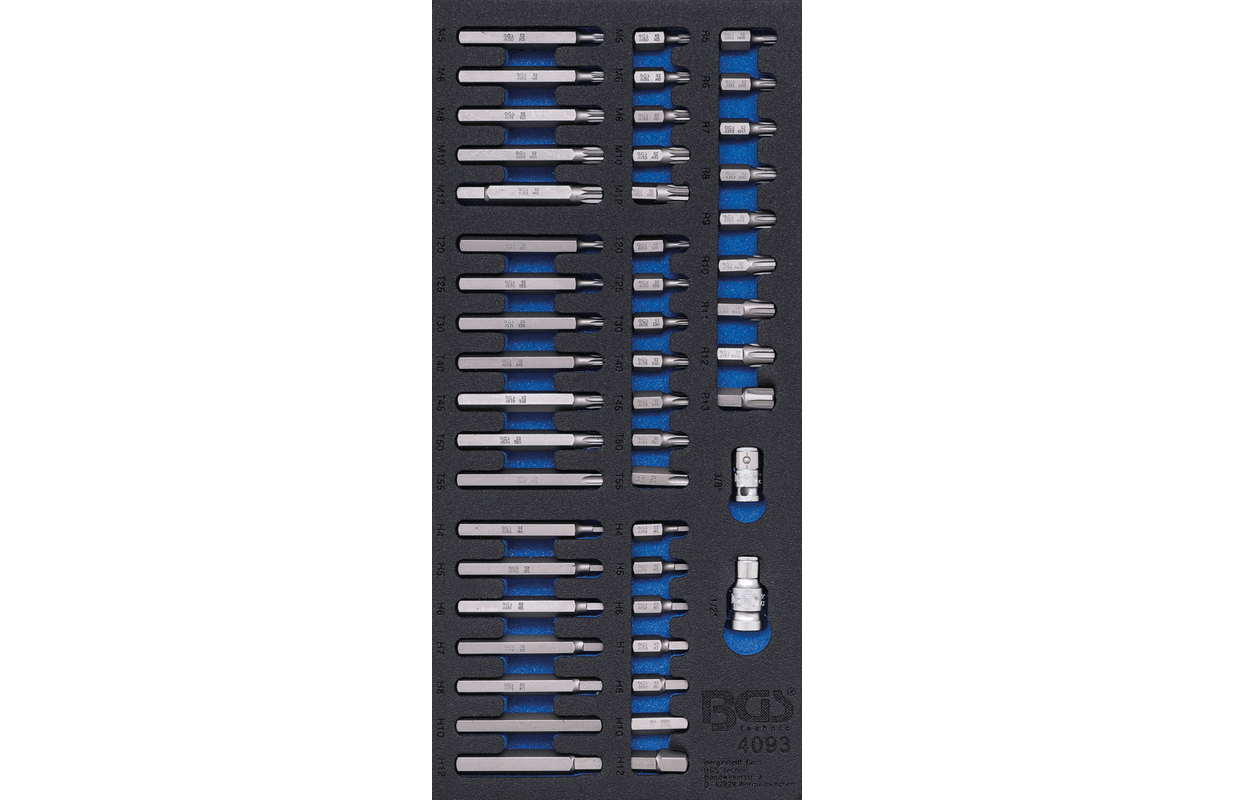 • 14 насадок, короткая и длинная версии, внешний шестигранник 10 мм (3/8"), Т-образный привод (для Torx): T20 - T25 - T30 - T40 - T45 - T50 - T55