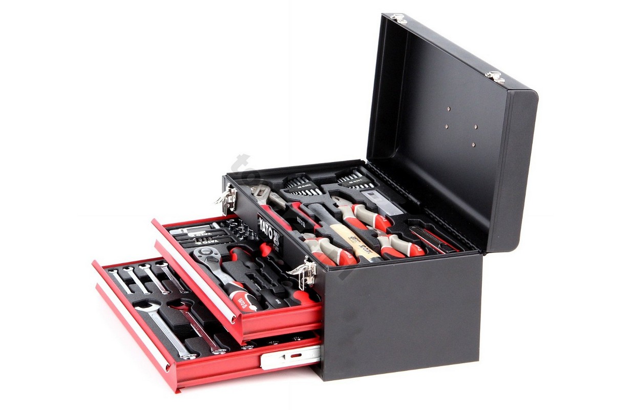 Ящик для инструментов марки Yato. Содержит 80 широко используемых в настоящее время ручных инструментов, полезных для ухода за рабочей зоной в мастерской для мелких работ в механической мастерской или гараже. Короб из оцинкованного листа 0,6 мм.