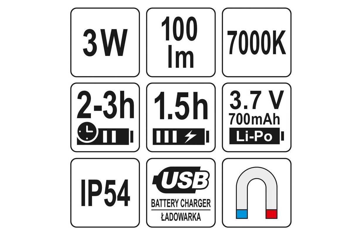 Универсальный, заряжаемый через USB-кабель светильник со световым потоком 100лм. Его универсальное использование возможно благодаря длинному гибкому стержню с магниевым наконечником. Его можно использовать, в том числе, как настольную лампу, прожектор, освещающий рабочее место или мастерскую. Дополнительным преимуществом является водонепроницаемость (IP54) и литий-полимерный аккумулятор, обеспечивающий до 3 часов непрерывной работы.