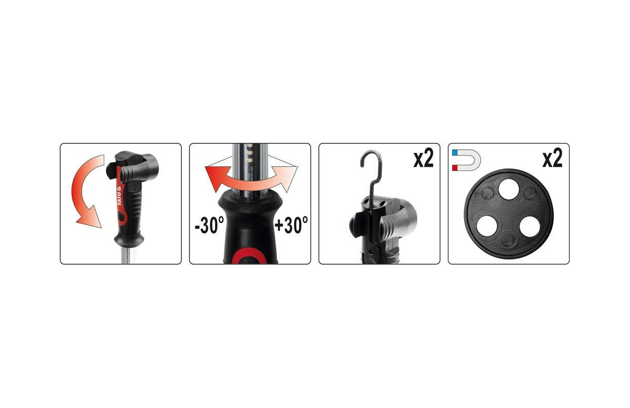 Лампа имеет магниты для установки в моторном отсеке. Он также имеет два крючка, благодаря которым его также можно использовать на немагнитных поверхностях.