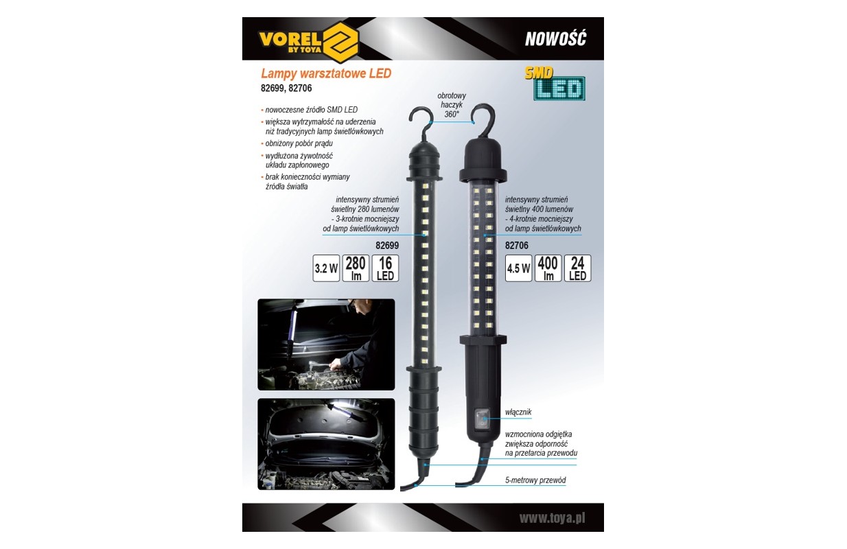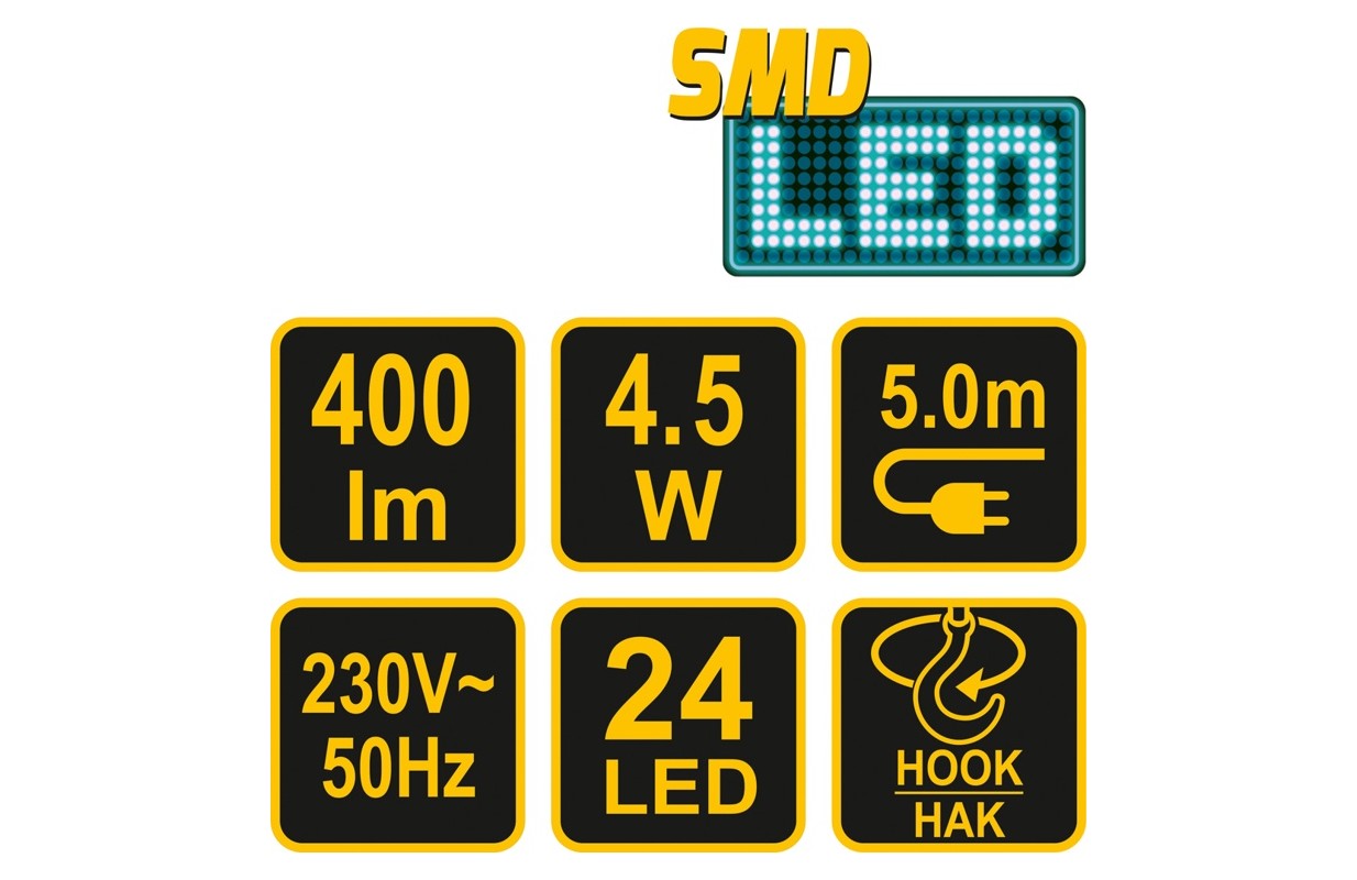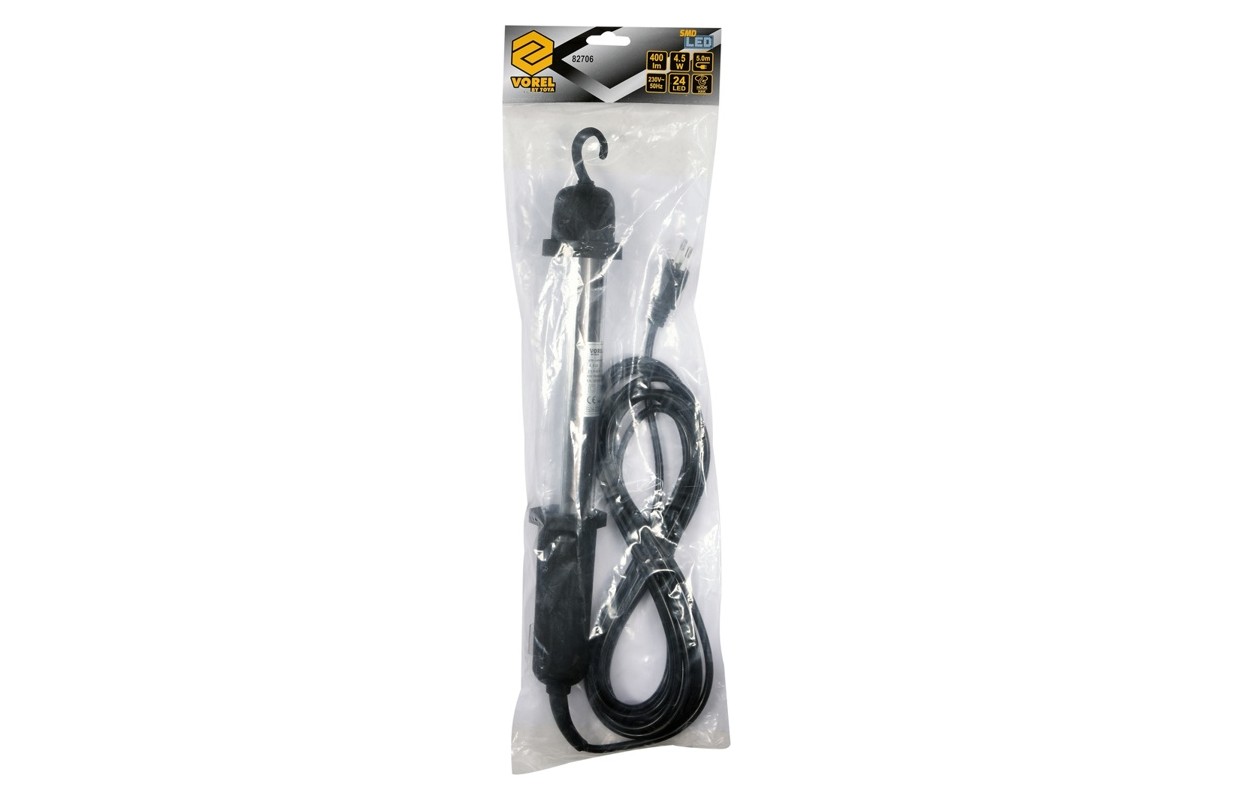 82706 - это универсальный, проводной переносной светодиодный SMD светильник. Он является идеальной заменой популярных недорогих люминесцентных ламп, обычно используемых в мастерских или гаражах DIY. Благодаря эффективным и современным светодиодам SMD, светильник обеспечивает в 4 раза большую светоотдачу - 400 лм. Применение светодиодного источника SMD означает дополнительные преимущества: