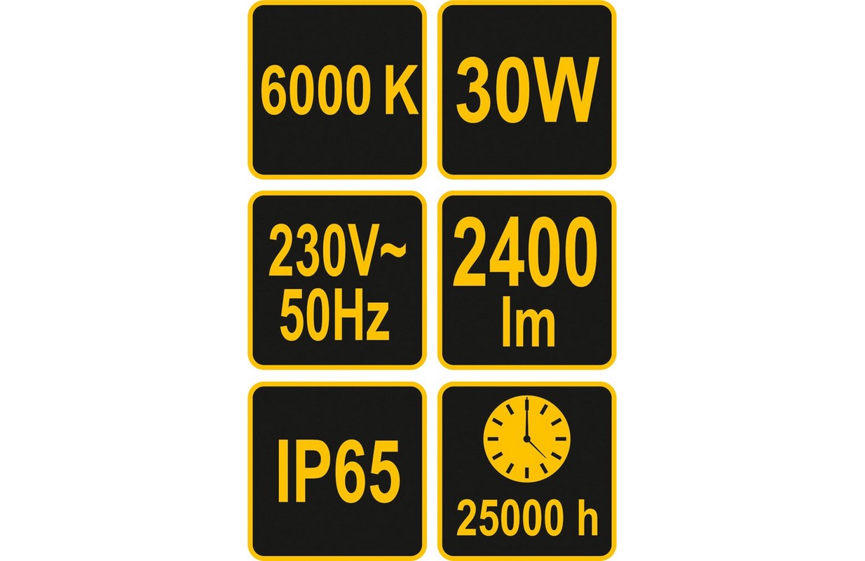 Упаковка коробка цветная коробка SMD LED 30W 2400LM; ALUMINUM HOUSING WITH TEMPERED GLASS; VOLTAGE: AC 220-240V,50HZ; CCT: 6000K; ИЗМЕРЕННАЯ ЦВЕТОПЕРЕДАЧА (RA): > 80; PF: > 0.9; СРОК СЛУЖБЫ: 25000 ЧАСОВ; НОМИНАЛЬНЫЙ УГОЛ ЛУЧА В ГРАДУСАХ: 120°; С КАБЕЛЕМ 0.3M H05RN-F 3G1.0MM2; IP РЕЙТИНГ: IP65