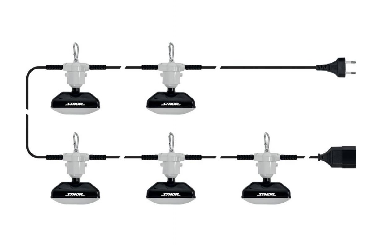 НЕТ Комплект из 5 точечных светильников COB общей мощностью 4500 лм. Фары соединяются кабелем длиной 15,4 м. Комплекты можно комбинировать (максимум 10 комплектов). Каждый прожектор имеет крючок для подвешивания. отражатель: COB 9 Вт (всего 45 Вт), 900 лм (всего 4500 лм)
