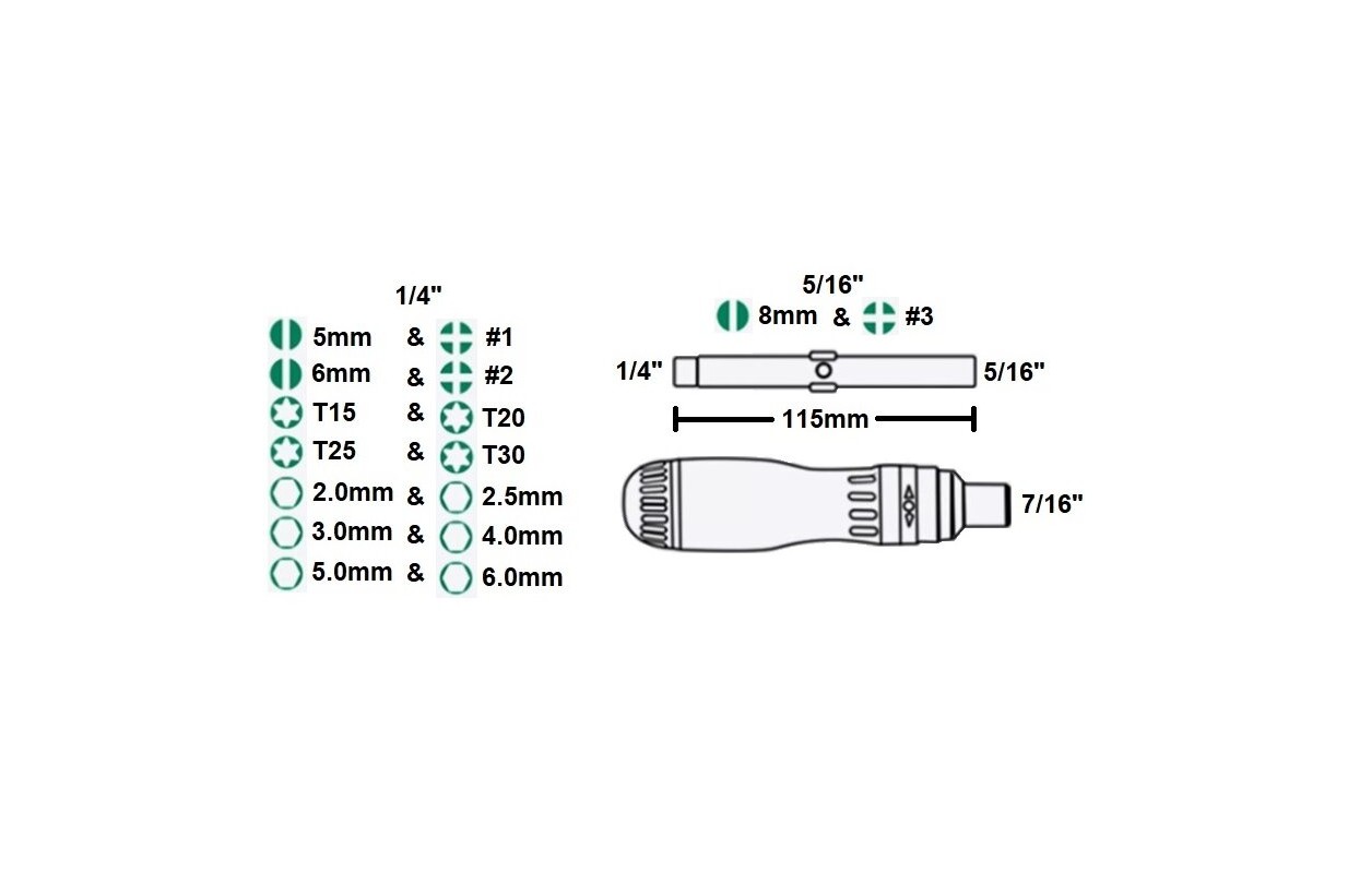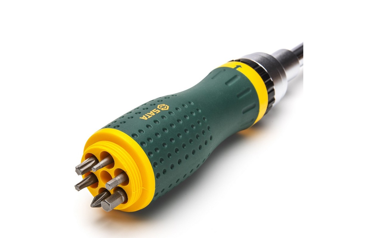 Лезвия из стали SCVM + обеспечивают прочность и сопротивление крутящему моменту, необходимые профессионалам. Плавный храповой механизм с тремя настройками, который эффективно работает в любом направлении Эргономичная ручка из двойного материала обеспечивает удобный захват и устойчива к маслам и растворителям. Съемная задняя крышка хранит все входящие в комплект биты внутри рукоятки для удобного переключения. Включает восемь двусторонних бит: 5, 6 и 8 мм со шлицем, № 1, № 2 и № 3 Philips, T15, T20, T25 и T30 Torx, а также шестигранные наконечники 2,0, 2,5, 3,0, 4,0, 5,0 и 6,0 мм. Размеры 254 х 51 х 51 мм Вес 435 г