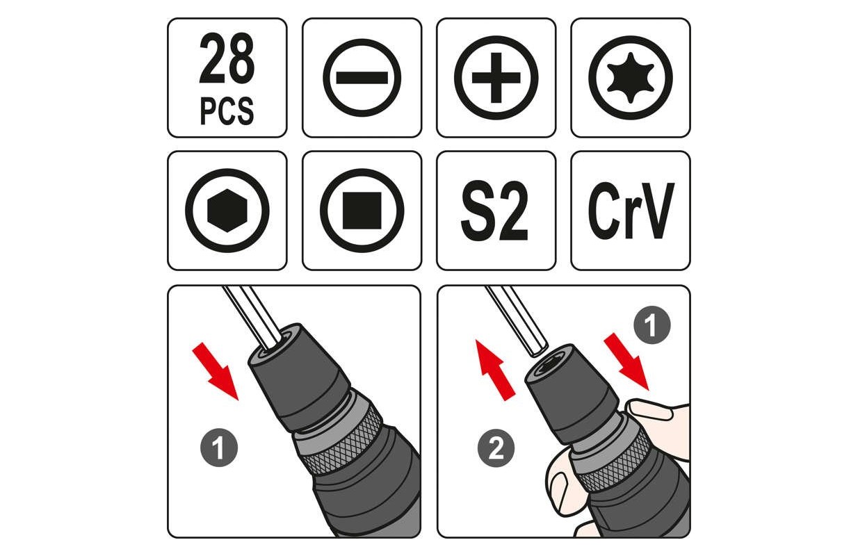 • 5 двухсторонних бит 115 мм: SL5.0 x SL6.0, PH1 x PH2, PH2 x PH3, S1 x S3, T10 x T15
