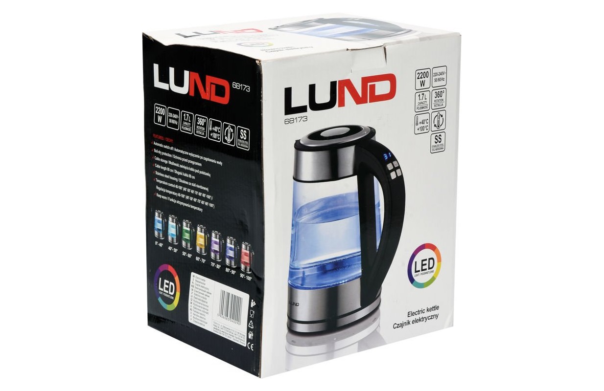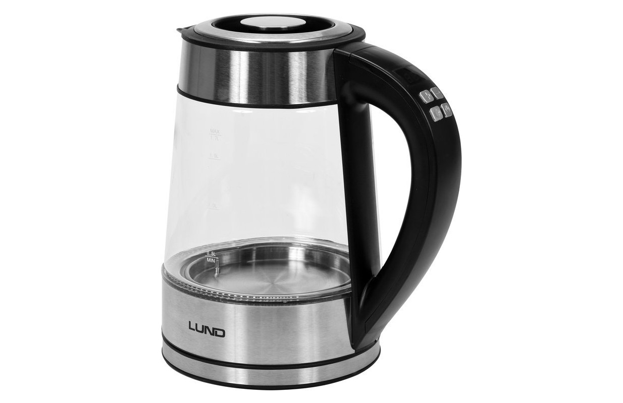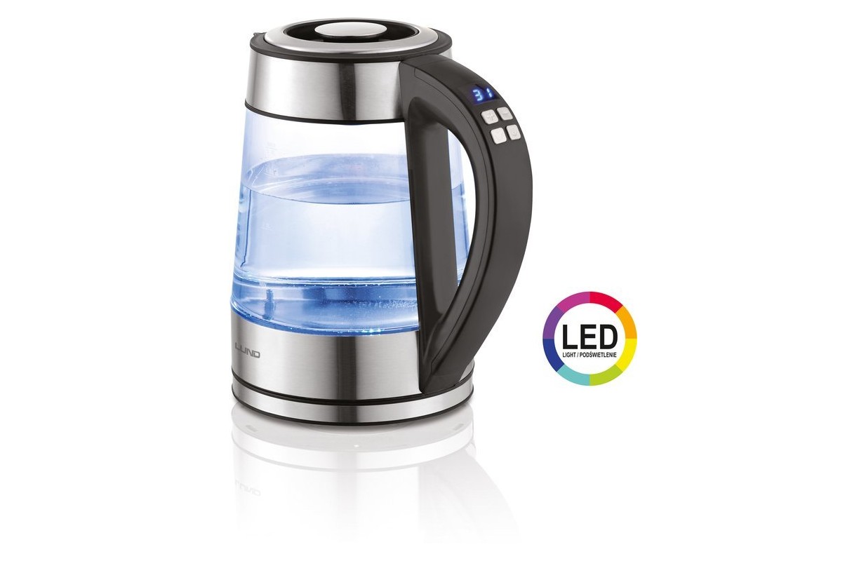 Стеклянный электрический чайник с функцией установки температуры и внутренним светодиодным кольцом, которое меняет цвет в зависимости от степени нагрева воды. ИНФОРМАЦИЯ мощность: 1850-2200 Вт