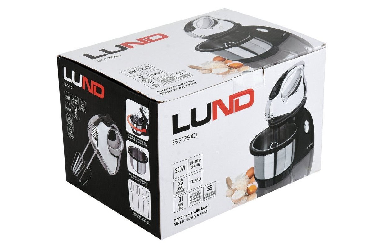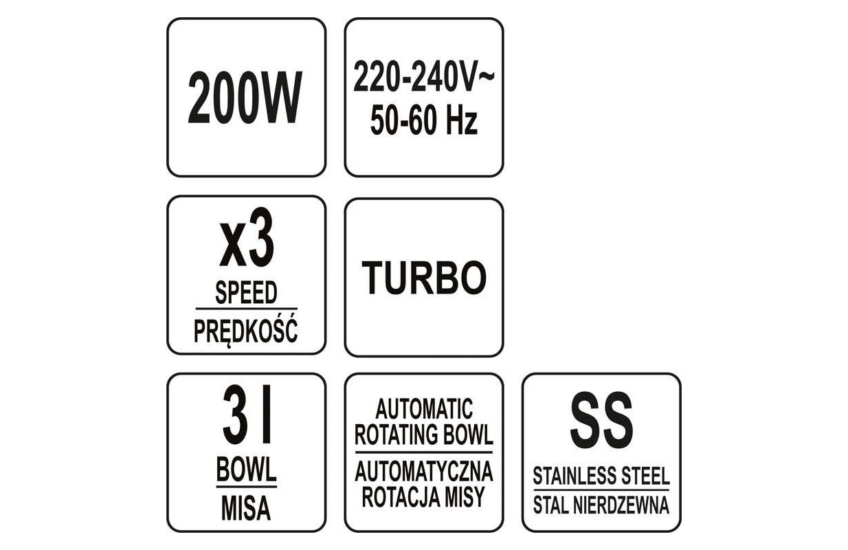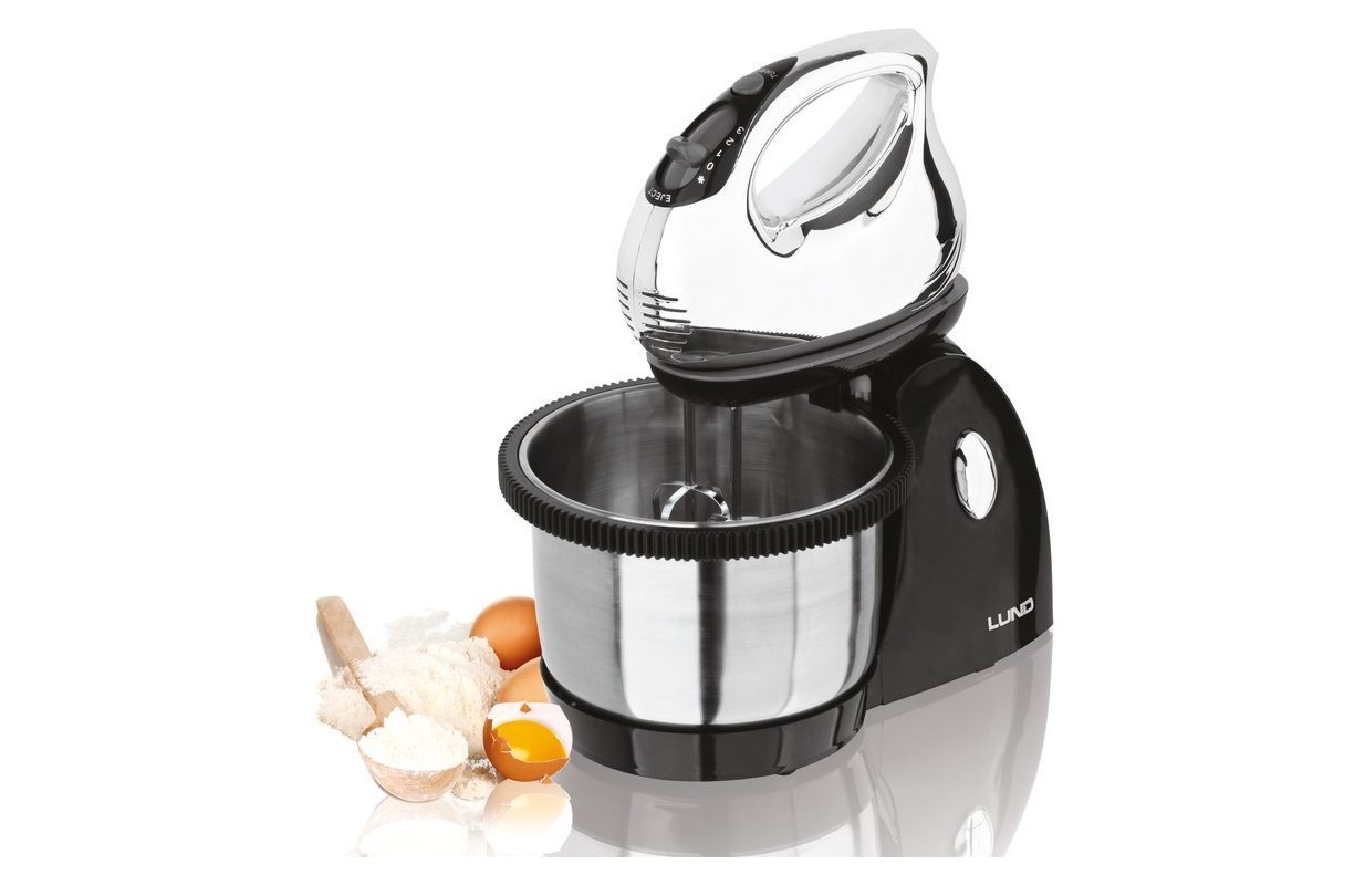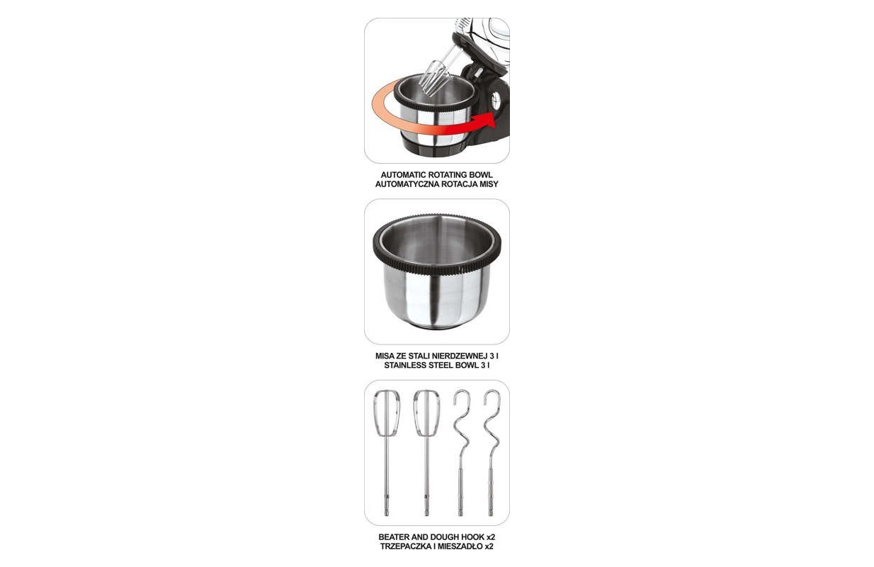 Многофункциональный миксер с чашей из нержавеющей стали. Идеально подходит для смешивания ингредиентов, замеса теста и взбивания пены. • высокая мощность: 200-250 Вт • турбо функция • регулирование скорости: 3 уровня • 3 л чаша из нержавеющей стали • автоматическое вращение чаши • прочный корпус из АБС-пластика • кнопка выпуска наконечника • эффективная система охлаждения • твердосплавные насадки • удобная ручка и эргономичная форма • длина кабеля: 80 см • размеры смесителя: 19,5 х 8,5 х 16 см • размеры с чашей: 33 х 20 х 34 см • 2 взбивалки и 2 мешалки, подставка и чаша включены