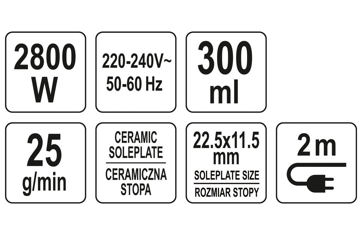Мощный паровой утюг обеспечивает легкое и эффективное глажение одежды и тканей. • быстрый нагрев и эффективное глажение благодаря высокой мощности 2800 Вт • 4 режима глажения – сухой, с паром, вспышками пара и вертикальным паром – для удаления складок из различных материалов • контроль температуры подходит для типа ткани • защита от перегрева • керамическая ножка размером 22,5 x 11,5 см обеспечивает хорошее скольжение и высокую прочность • размеры устройства: 28 х 11,5 х 14 см • максимальная паропроизводительность: 25 г/мин • опрыскиватель • блокада капель • функция самоочистки предотвращает загрязнение одежды при глажении • система против кальцификации исключает образование шлама и накипи • резервуар для воды на 300 мл • 2 м кабель • в комплекте мерный стаканчик для воды