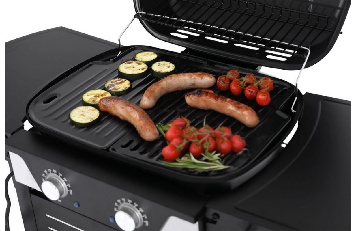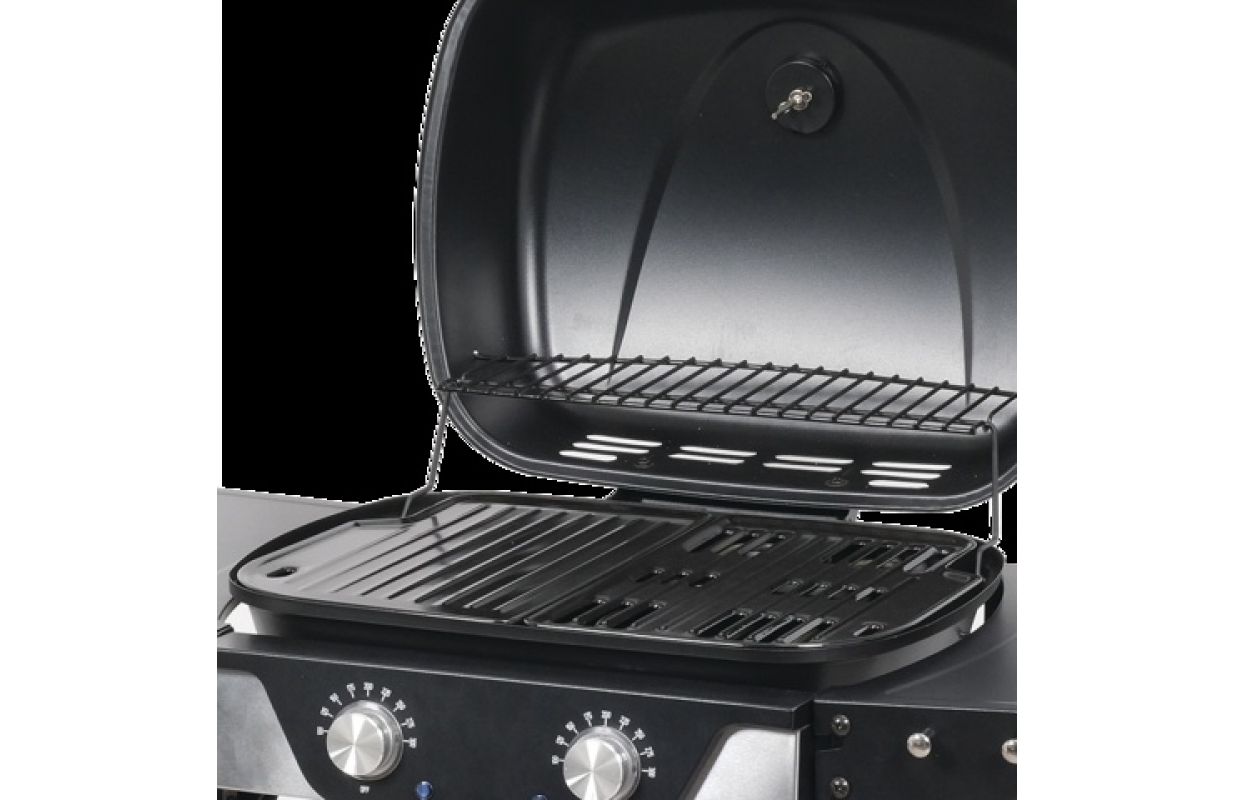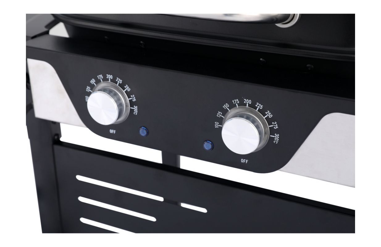 ✔ чехол со встроенным термометром ускоряет процесс приготовления на гриле и защищает от ветра; Кроме того, дым от блюд придаст им нужный вкус и аромат ✔ 6 вешалок для аксессуаров и откидные боковые полки обеспечивают дополнительное рабочее пространство ✔ Прозрачные хромированные ручки регулировки температуры ✔ Складные боковые полки позволяют грилю занимать мало места и их легче хранить и транспортировать Гриль оснащен двумя нагревателями общей мощностью 2300 Вт и обеспечивает впечатляющую эффективность нагрева. Его уникальной особенностью является 2-зонный контроль температуры в диапазоне 100 - 300°C, позволяющий одновременно готовить разные блюда при разных температурах. Гриль имеет эмалированную решетку с поверхностью нагрева 47 х 37 см, обеспечивающую большую площадь для гриля.
