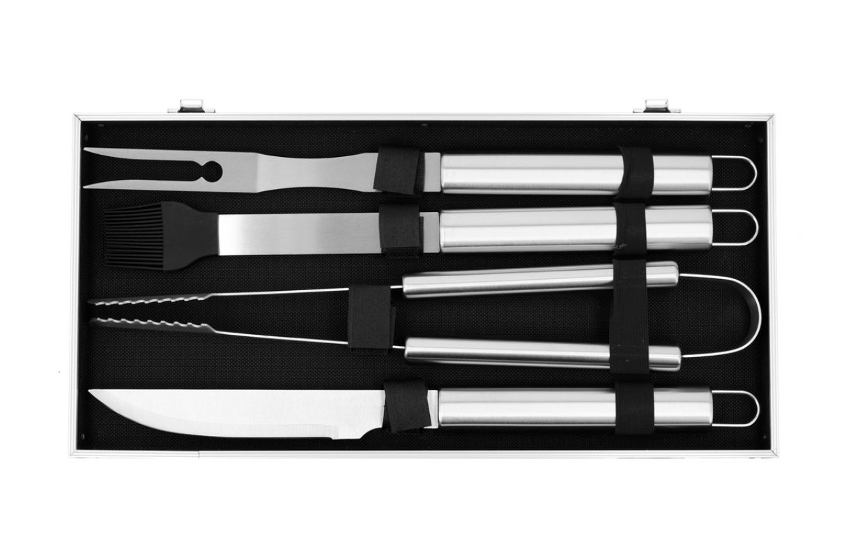 YG-20111 Набор столовых приборов из нержавеющей стали для приготовления на гриле. В комплекте: вилка, щипцы, лопатка, нож, ножницы, щётка и щётка.