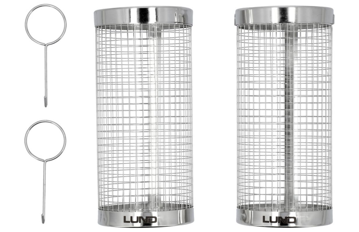 99835 2 стальные корзины для гриля в форме закрытых рулонов. Идеально подходят для приготовления на гриле небольших ингредиентов, порционных кусков мяса или овощей. материал: нержавеющая сталь SS430