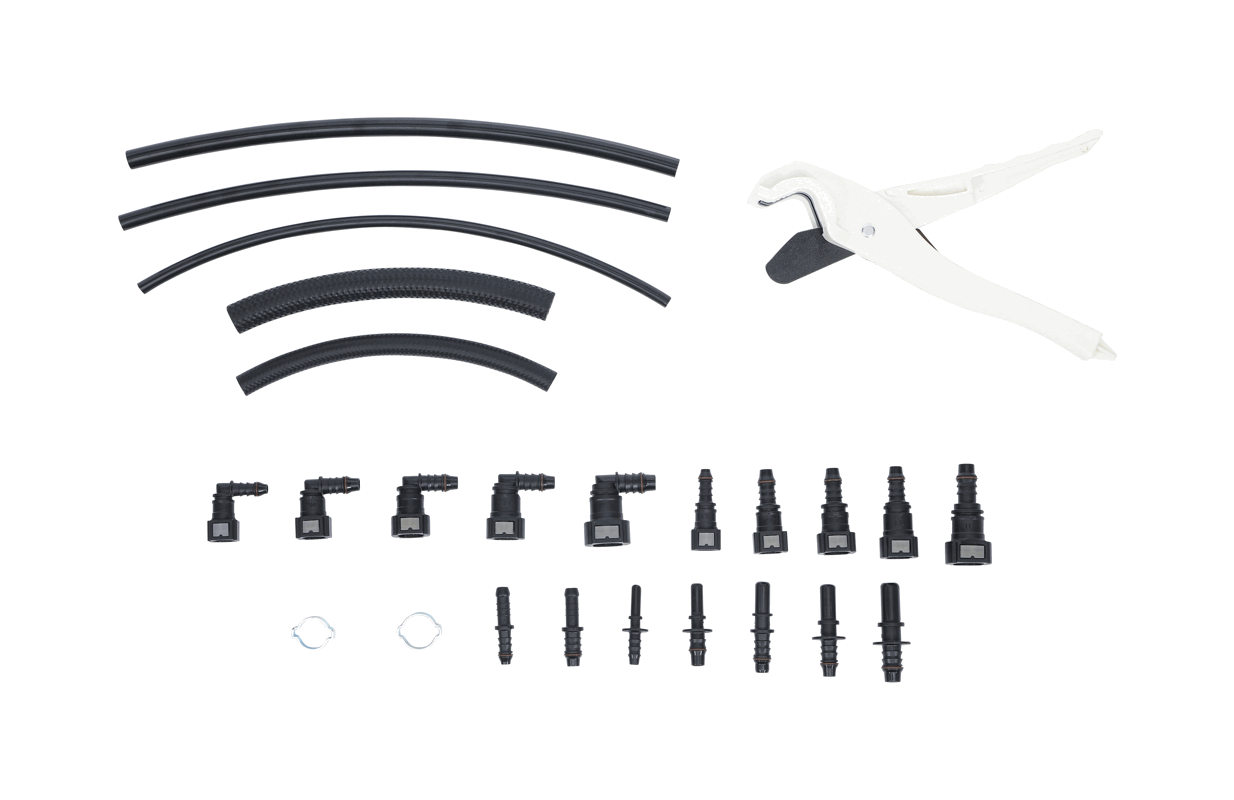 • Содержит пластиковые трубопроводы, резиновые шланги, штекерные соединения и муфты в прямом и угловом исполнении различных диаметров.