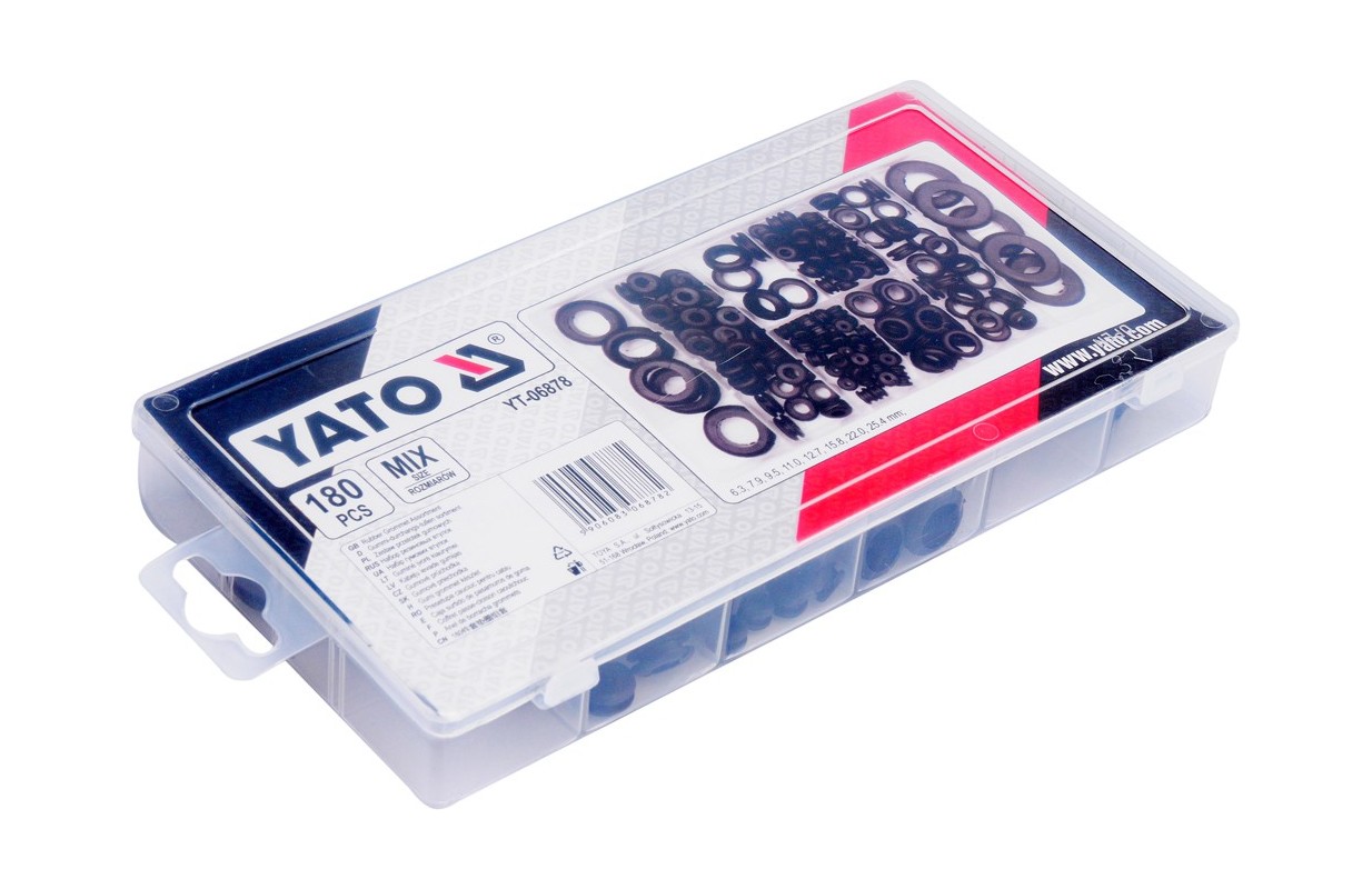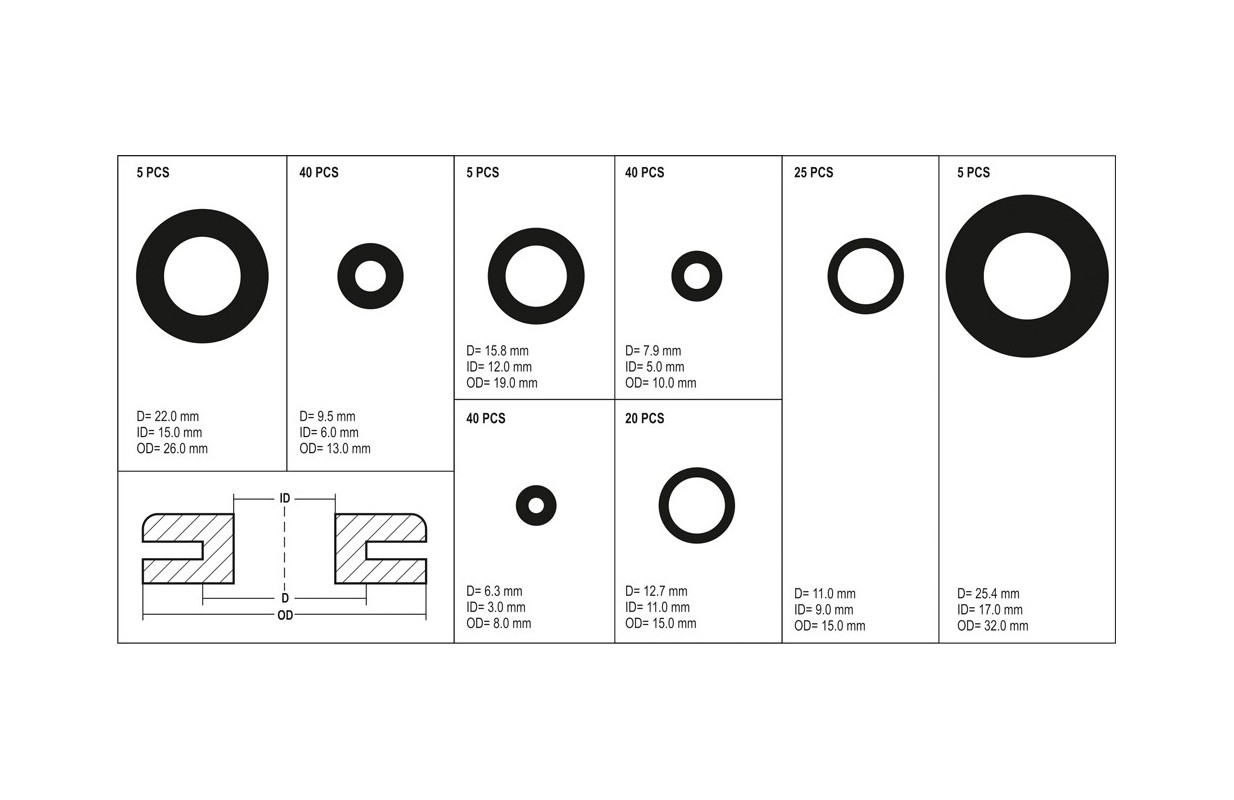 Набор резиновых прокладок содержит 180 штук разного размера. Все это было помещено в удобную упаковку типа "сортер". Параметры