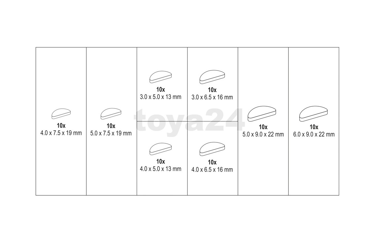 3*5*13 мм: 10 шт.; 3*6,5*16 мм: 10 шт.; 4*5*13 мм: 10 шт.; 4*6,5*16 мм; 10 ШТ; 4*7,5*19 мм: 10 шт.; 5*7,5*19 мм: 10 шт., 5*9*22 мм: 10 шт.; 6*9*22 мм: 10 шт.;