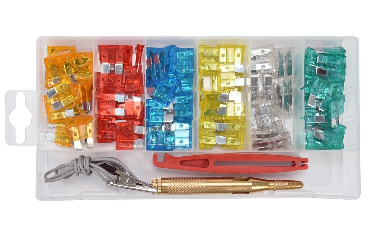 Комплекты предохранителей для защиты электроустановок автомобилей от повреждений, вызванных чрезмерным током. Используется, среди прочего для компрессоров, электронасосов, выпрямителей, розеток-распределителей. Упакован в удобный кейс.