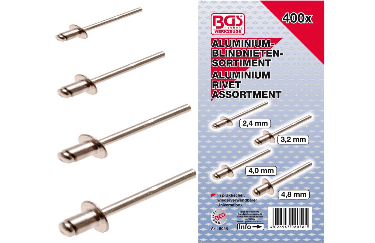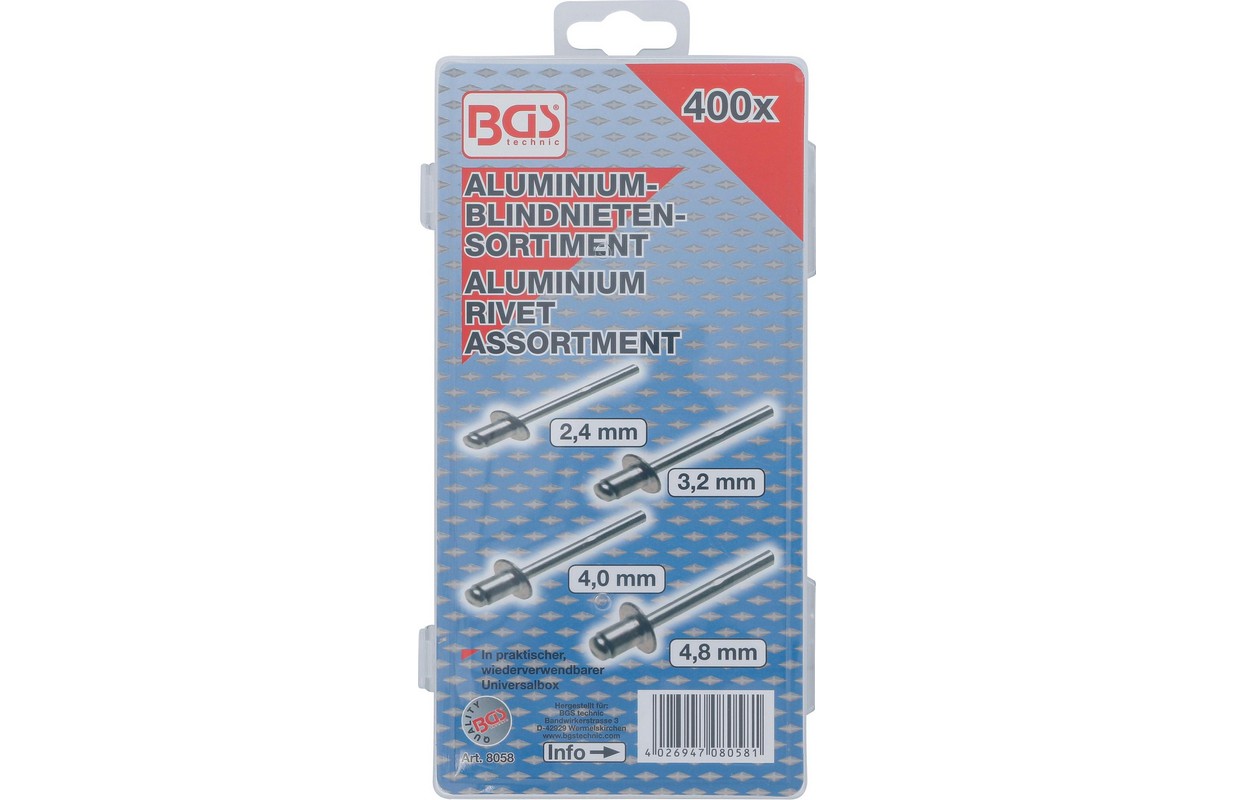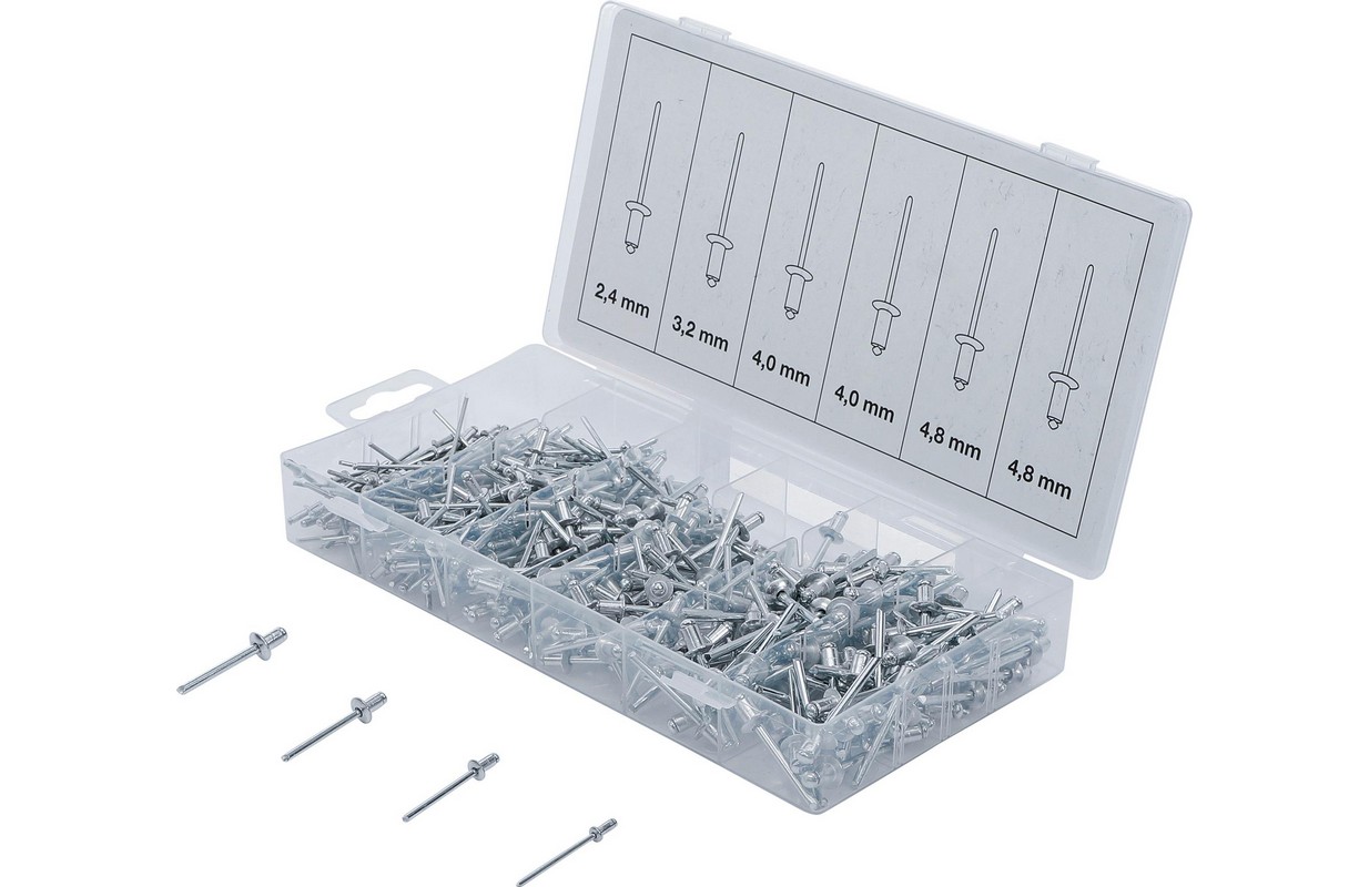 Описание отсортированный длина заклепки: 6 мм Размеры 2,4 - 3,2 - 4 - 4,8 мм штифт из стали в пластиковом кейсе для хранения Технические данные Вес брутто 520 г Упаковка подходит для настенного монтажа Да