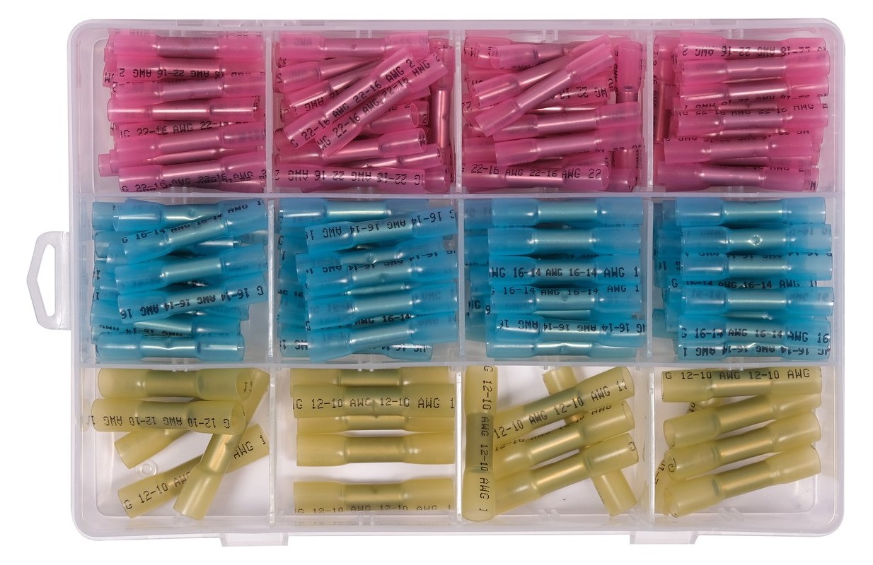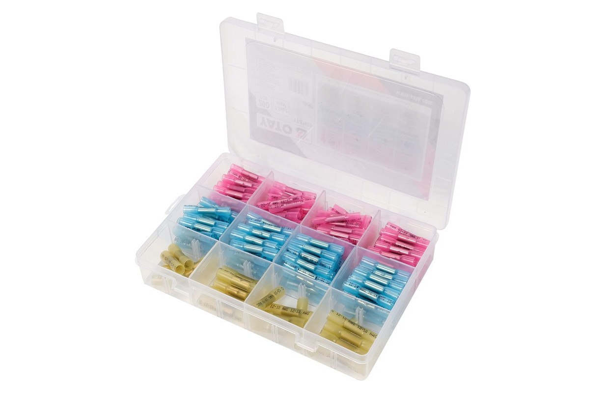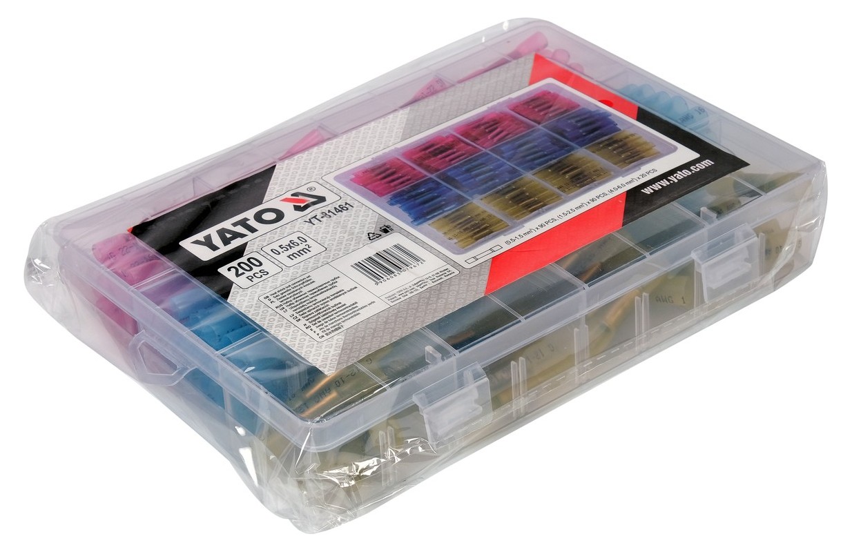 Комплект обжимных гильзовых соединителей, смонтированных на термоусадочной трубке YT-81461 , найдет свое применение в первую очередь в местах, где слишком высокая температура окружающей среды может негативно сказаться на соединении проводов традиционной пайкой (например, в моторном отсеке). Медный коннектор при правильной обжимке гарантирует самые высокие параметры проводимости, а благодаря двухслойной термоусадочной трубке, установленной на коннектор, мы получаем герметичное соединение и нет необходимости использовать традиционные гильзы или изоляционную ленту