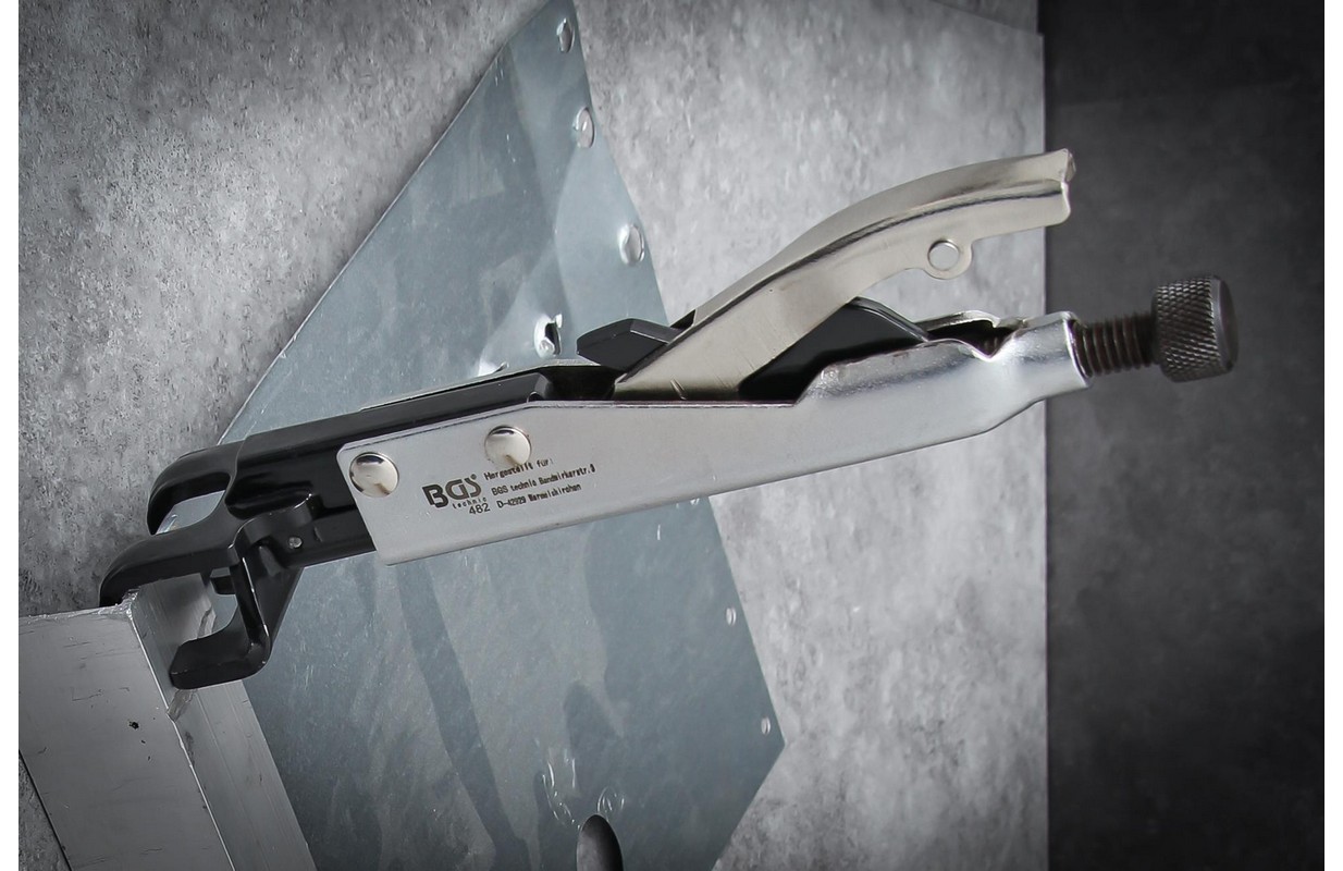 Описание для обработки кузовов автомобилей, ковки и зажима дверных коробок, боковых панелей колесных арок, фланцев, листов и многого другого для точечной сварки между губками возможны различные варианты применения (например, боковые панели, крыша и т. д.) Технические данные Длина 210 мм Вес брутто 510 г