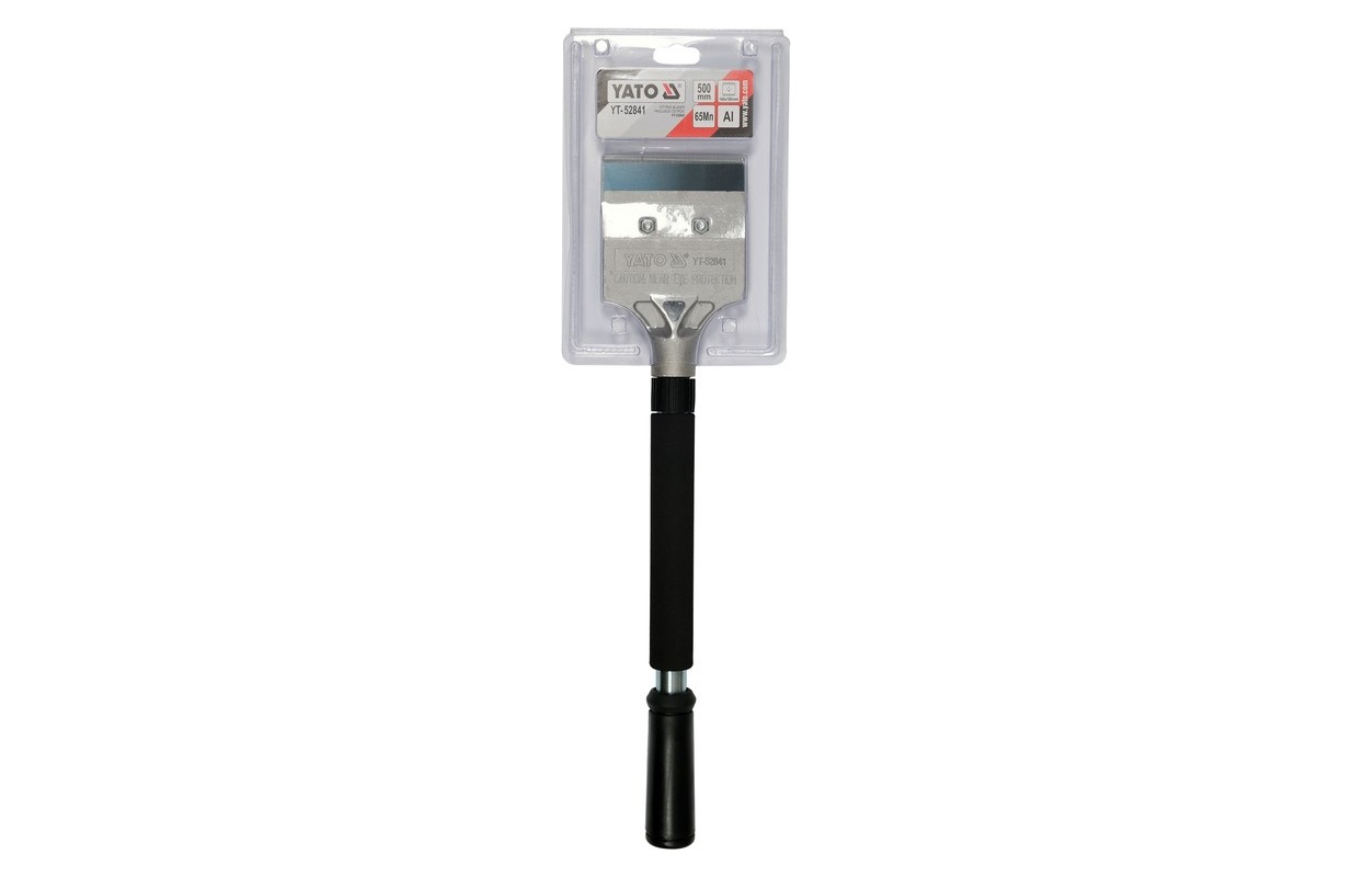 Скребок для пола, тяжелая конструкция, ручка, предназначенная для удара, сделана из стальной трубы, покрыта губкой. Головка - литой алюминий, лезвие из стали 65млн, прочно закреплено двумя винтами. Общая длина 500 мм, ширина лезвия -100 мм, толщина 1,5 мм / вращающееся лезвие, заточено с обеих сторон, что значительно продлевает срок службы инструмента. Предложение включает сменные лезвия yt-52843