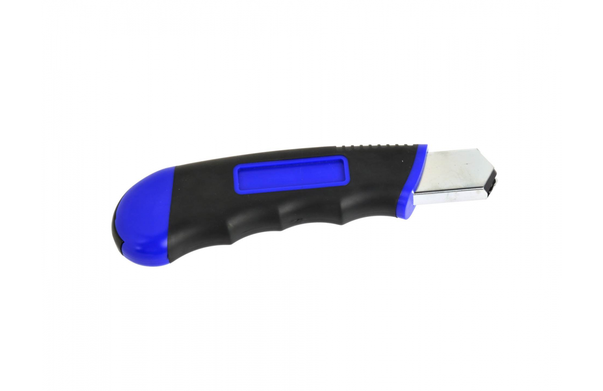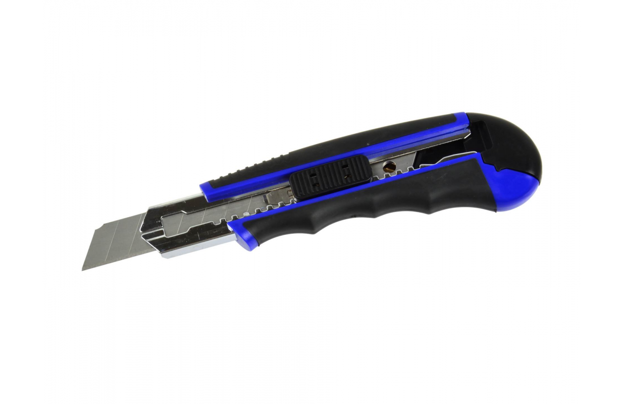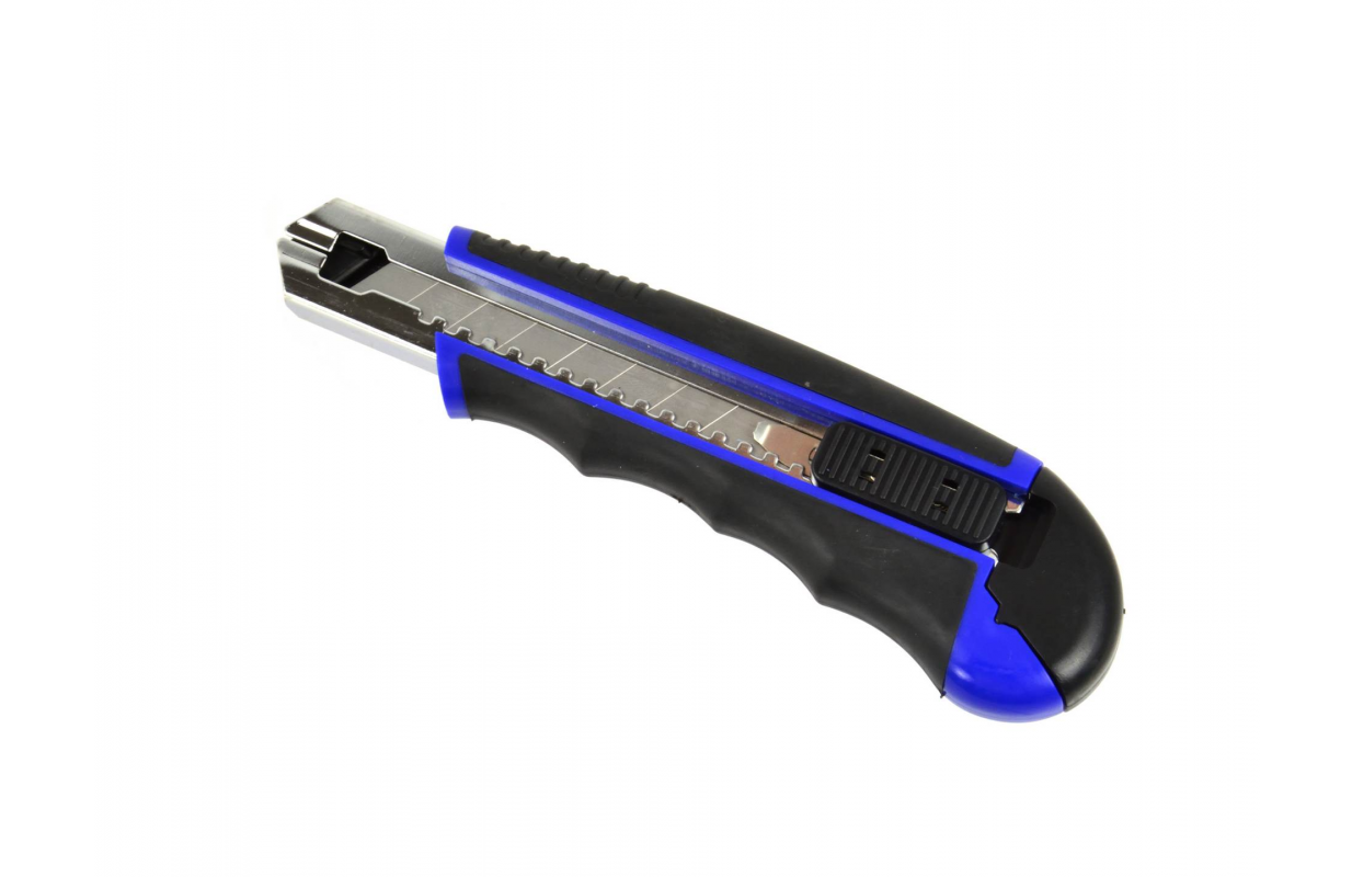 Универсальный нож, оснащенный Сломанное лезвие 18 мм. Нож изготовлен из пластика, Рукоять профилирована и покрыта нескользящей резиной. Оснащен магазином лезвий. Когда одно лезвие израсходовано, а направляющая втянута, автоматически загружается следующее лезвие.