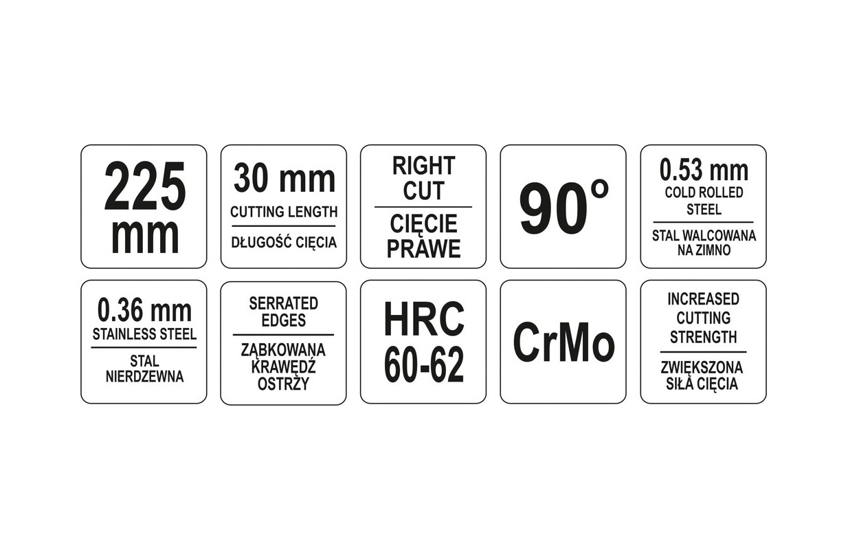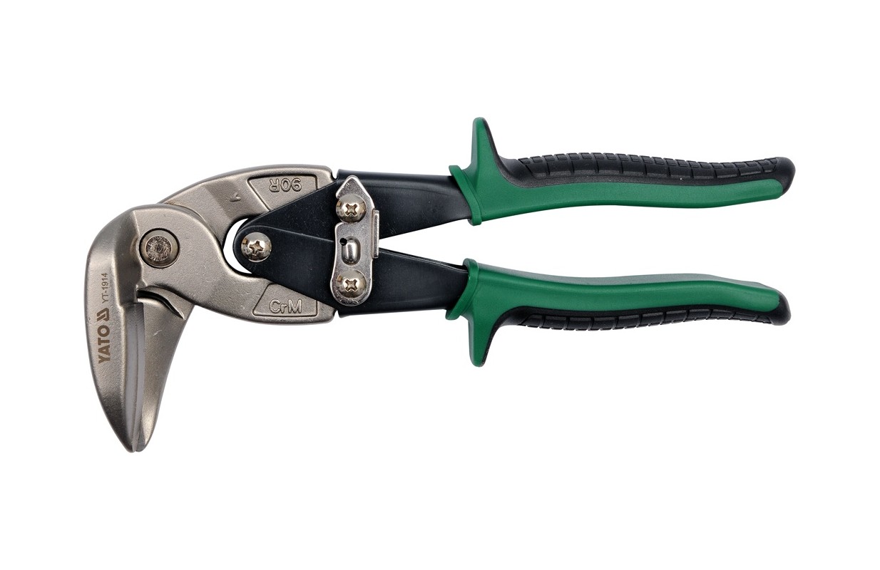 Профессиональные ножницы для стрижки листового металла, кованая сталь CrMo, индуктивно закаленные губки на твердость 60-62 HRC, поверхность обработана пескоструйной обработкой. Рукоятки покрыты защитными накладками из твердого пластика. Головка ножниц отогнута от оси инструмента на 90 градусов.