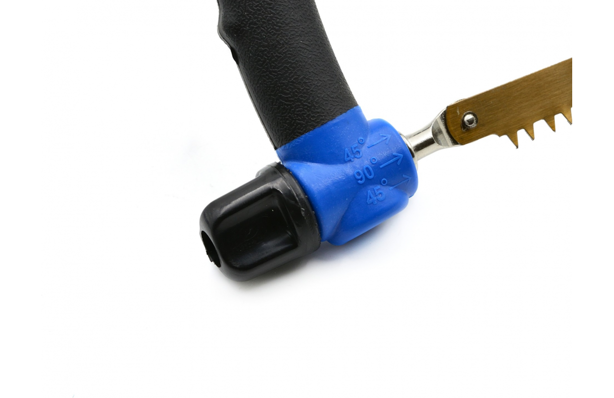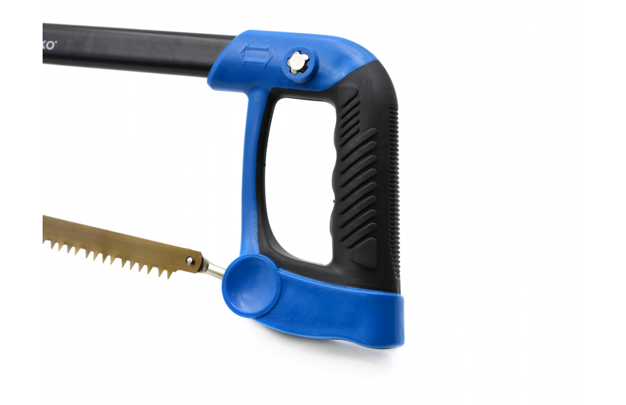 Лучковая пила для резки металла 300 мм с регулировкой угла 0, 45 и 90 градусов. Нескользящая ручка, покрытая мягкой резиной. Регулировка натяжения полотна позволяет правильно натянуть пильный диск. Он позволяет резать заготовки диаметром до 100 мм.