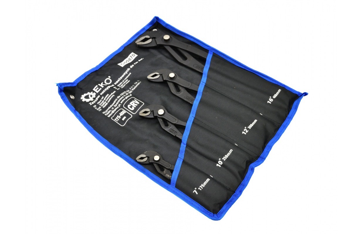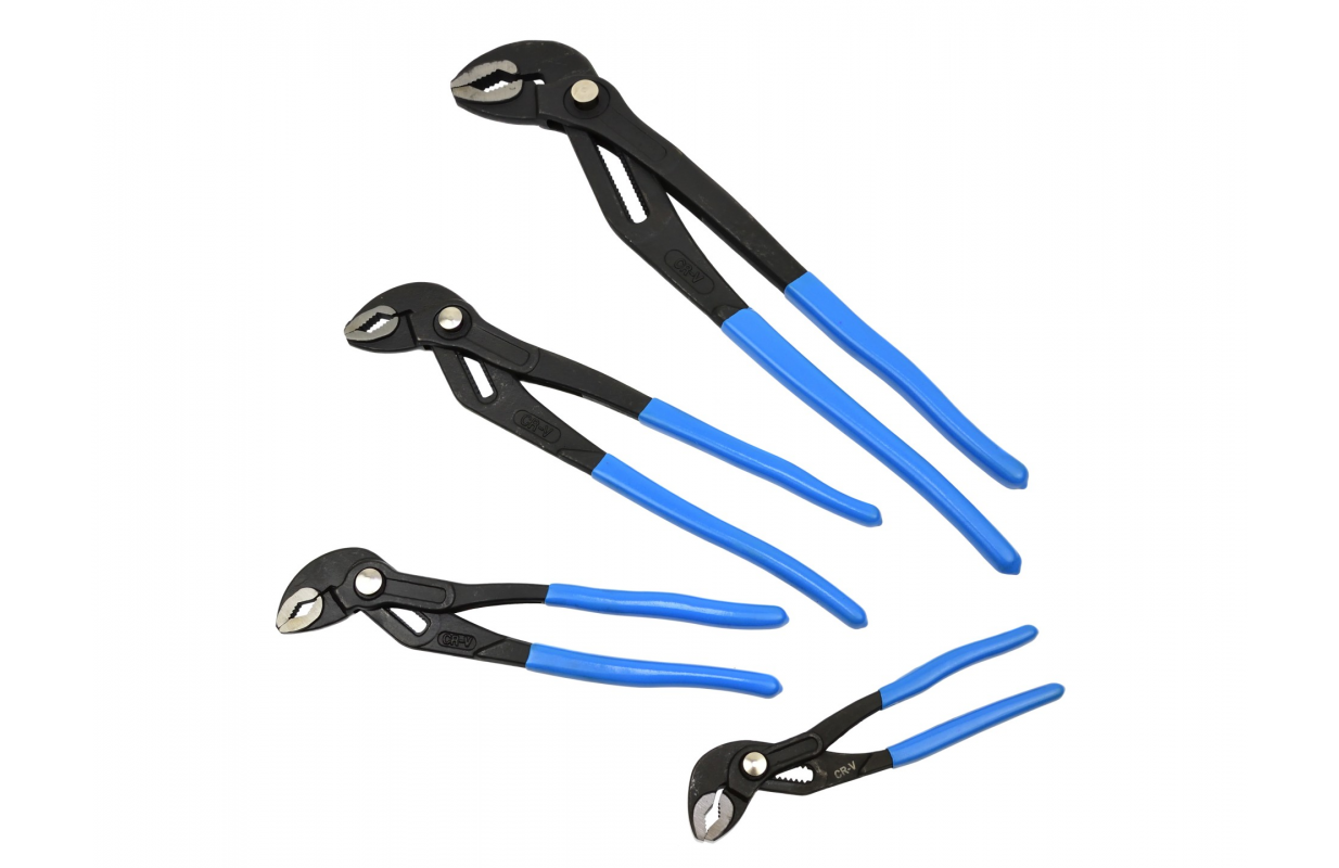 Набор плоскогубцев для водяного насоса изготовлен из прочной инструментальной стали CrV. Предназначен для захвата труб, угловых профилей, гаек и т.д. В комплект входят плоскогубцы четырех размеров.