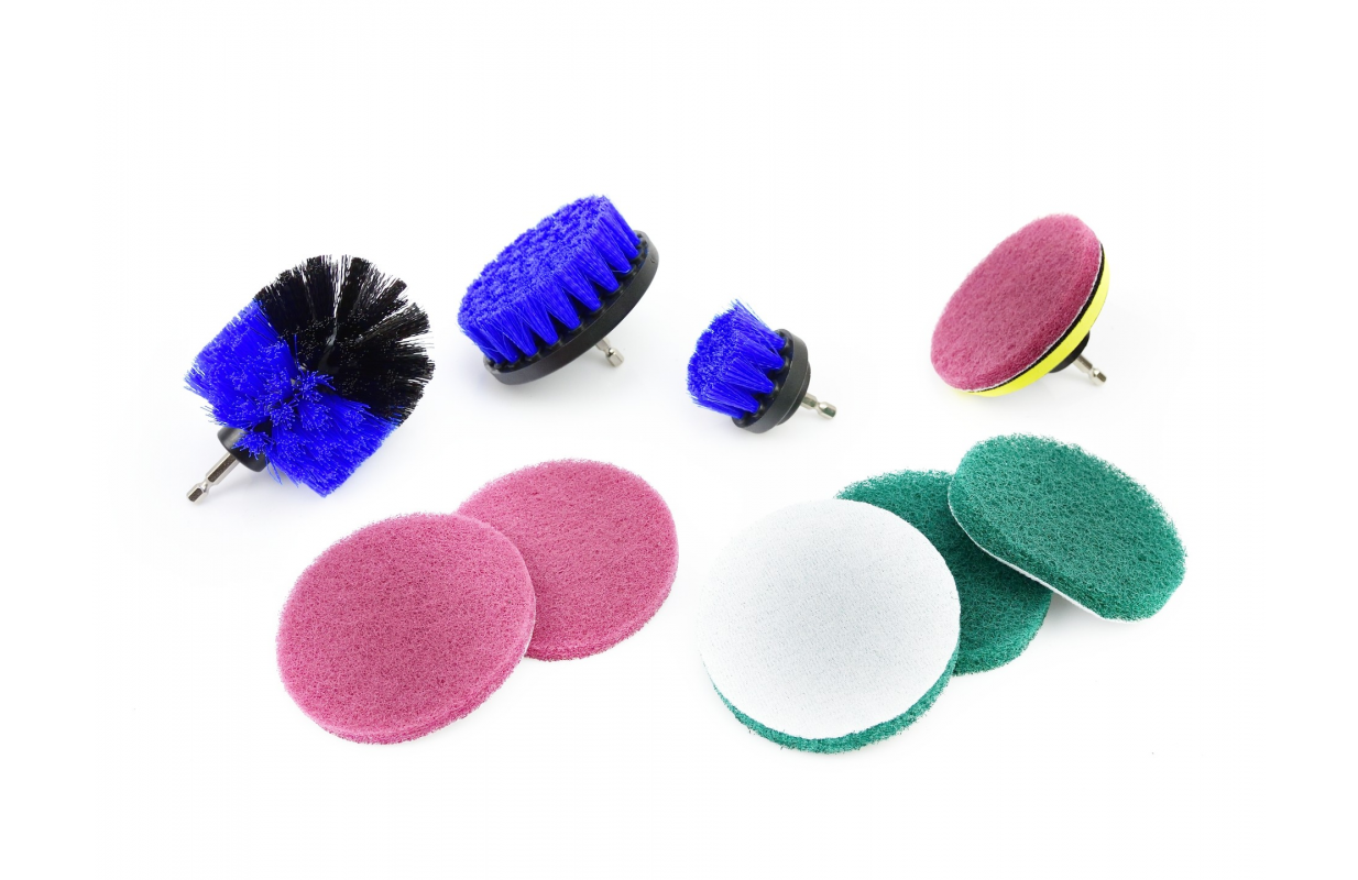 Набор чистящих щеток для шуруповерта. Изготовлен из нейлона средней жесткости, что обеспечивает эффективную очистку различных типов. В комплект входят 3 вида щеток разной формы и размера, дополнительный диск с Velcro и специальные подушечки (6 шт). Они отлично подойдут как для домашних дел, так и для мытья дисков или чистки салона автомобиля.