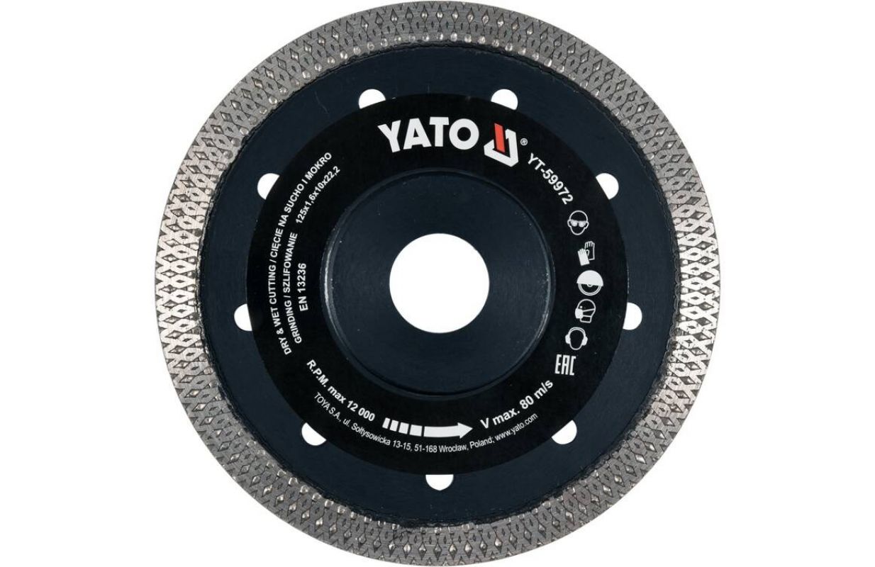 Метка Ято Символ ИТ-59972 Диаметр 125мм Монтажный диаметр 22,2 мм Высота режущего сегмента 10мм Толщина режущего сегмента 1,6 мм Химический состав режущего сегмента Fe 20%, Cu 55%, Sn 7%, Ni 8%, Co 10%, алмазное покрытие 15% Материал Сталь 65Mn Макс. обороты в минуту 12000 мин⁻¹ Максимальная линейная скорость диска 80 м/с Приложение керамическая плитка, глазурованная плитка, каменная черепица, стекло, фарфор, керамика, керамогранит, черепица Вид работ сухая, влажная