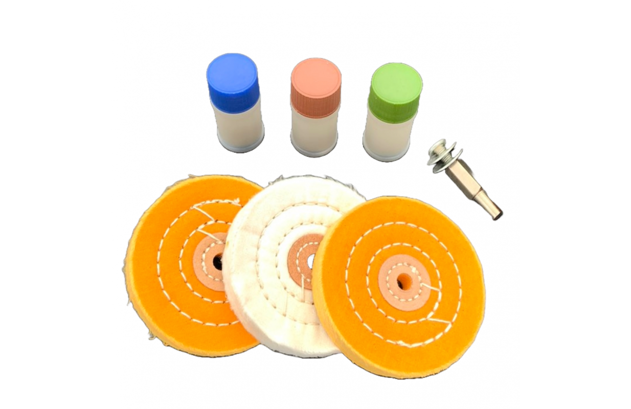 В комплект входят различные типы чистящих и полирующих составов для использования с различными полировальными дисками и патрон для крепления к аккумуляторной/шнуровой дрели.