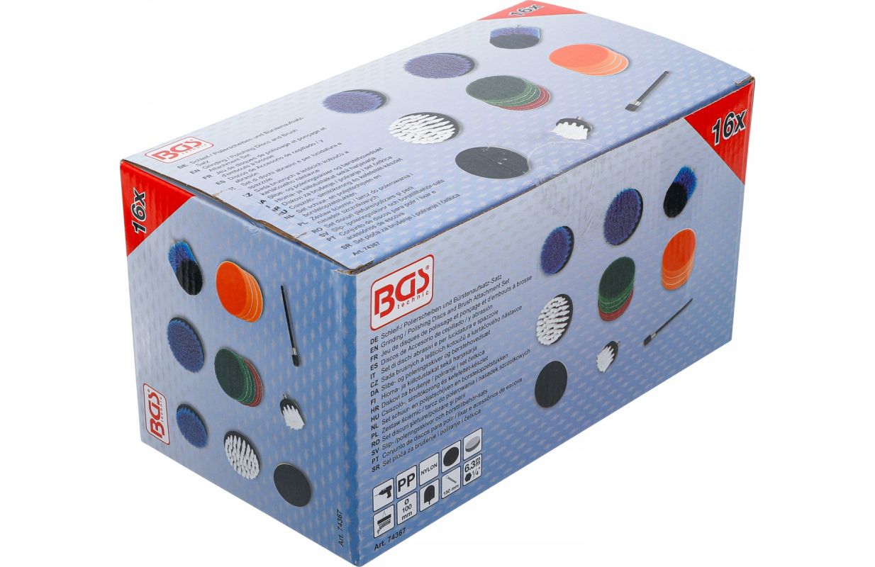 1 насадка-щетка | для BGS 74367 | Ø 100 мм (4") (BGS 74371) 1 насадка-щетка | для BGS 74367 | Ø 125 мм (5") (BGS 74373) 1 насадка-щетка | для BGS 74367 | Ø 90 мм (3,5 дюйма) (BGS 74375) 1 насадка-щетка | для BGS 74367 | Ø 100 мм (4") (BGS 74374) 1 насадка-щетка | для BGS 74367 | Ø 50 мм (2") (BGS 74372) 1 комплект шлифовальных дисков | нетканый материал | для BGS 74367 | 6 шт. (BGS 74368) 1 набор губок для полировки | для BGS 74367 | 3 шт. (BGS 74369) 1 накладка на липучку | для BGS 74367 | Диск 6,3 мм (1/4 дюйма) | Ø 100 мм (BGS 74370) 1 автоматический битодержатель | внутренний шестигранник 6,3 мм (1/4") | 150 мм