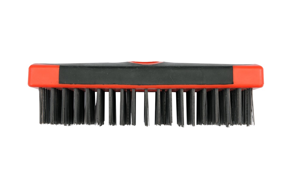 Изготовлен из оцинкованной эластичной стальной проволоки, прочно встроенной в пластиковый корпус. Щетка имеет отверстие в корпусе для крепления типичной деревянной ручки.