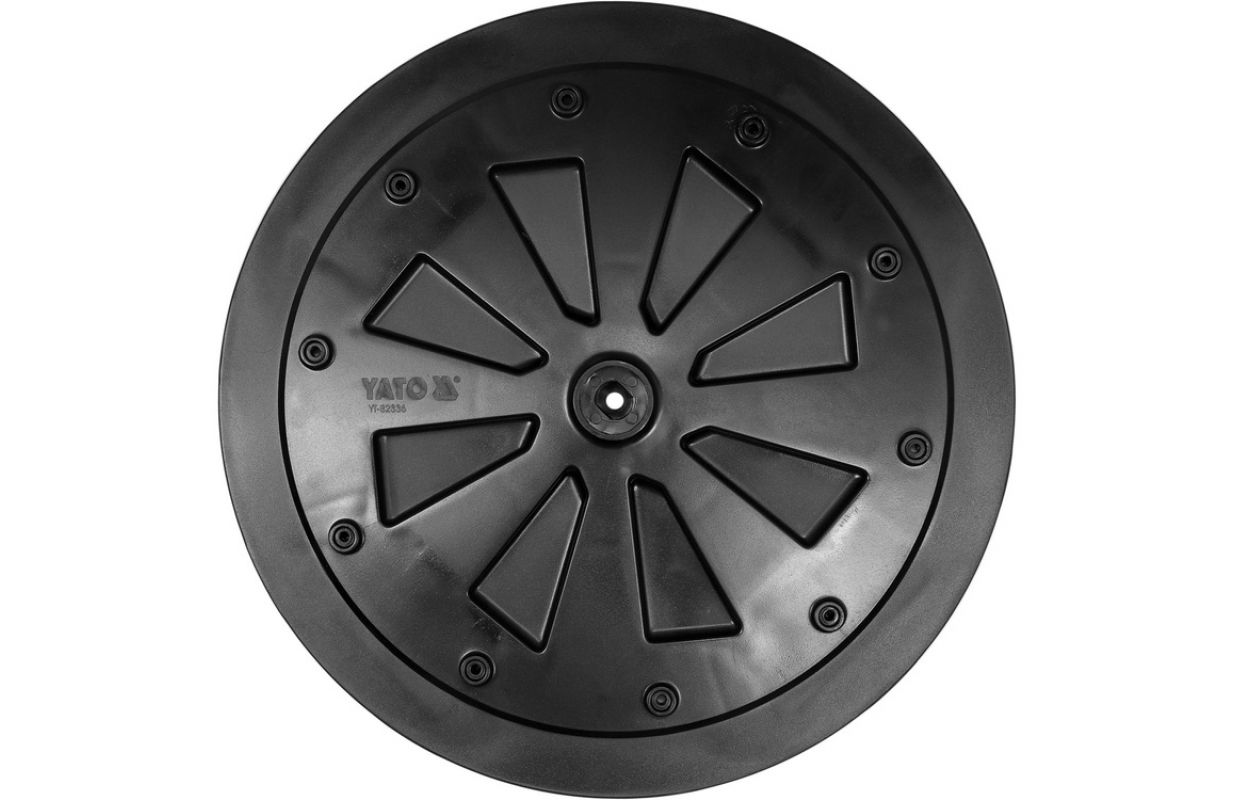 Запасной диск для затирочной машины YT-82330. Позволяет устанавливать губку, наждачную бумагу или металлическую накладку для выравнивания поверхности штукатурок и цементных растворов. Диск совместим с популярными моделями кельм, представленными на рынке.
