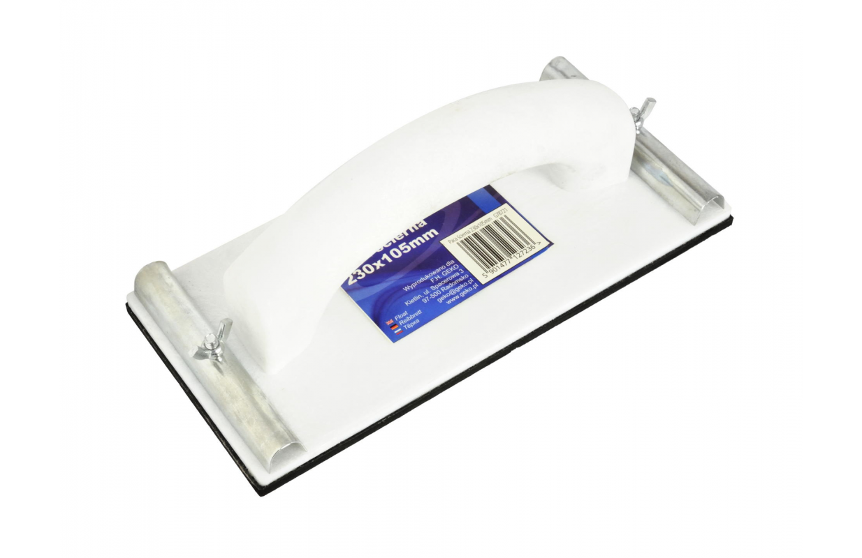 Блок наждачной бумаги размерами 230х105 мм изготовлен из высококачественного пластика. Поверхность, к которой прилипает бумага, покрыта микрорезиной для улучшения адгезии бумаги. Абразив скрепляется двумя металлическими хомутами, затянутыми гайкой-бабочкой.