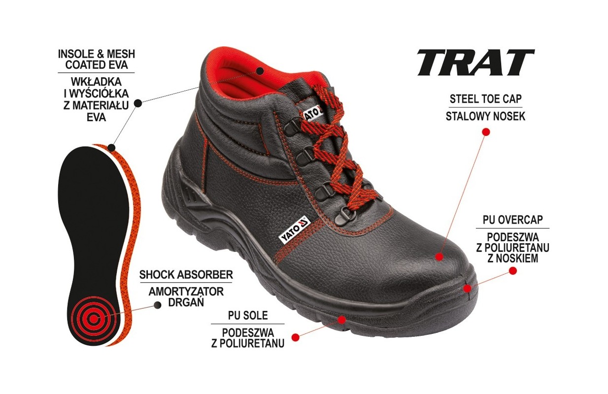 Рабочая обувь YT-80735 из серии TRAT S1 — модель с ударопрочным стальным подноском и специально разработанной частью подошвы, перекрывающей носок обуви для предотвращения повреждения этого часть: