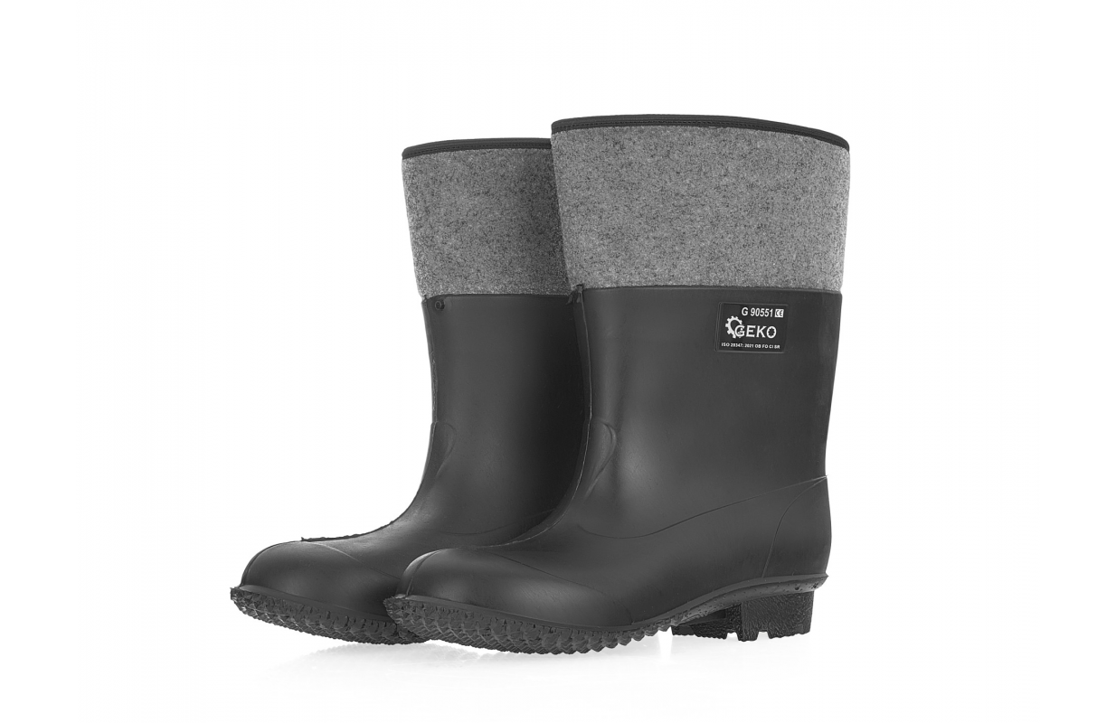 Резиновые сапоги из ПВХ герметичны, защищают от воды, влаги, масел и скольжения по основанию из керамической плитки (SR). Обувь с войлочной подкладкой обеспечивает изоляцию изнаночной стороны от холода.
