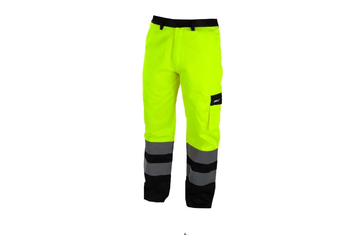 Светоотражающие защитные брюки сшиты из смеси полиэстера и хлопка плотностью 250 гсм. Брюки имеют эластичный пояс. 5 практичных и функциональных карманов и петля для молотка. Для обеспечения видимости в сложных условиях или после наступления темноты брюки имеют светоотражающие полоски на ногах и дополнительно на поясе. Доступны размеры от S до 2XL. Цвет желтый.