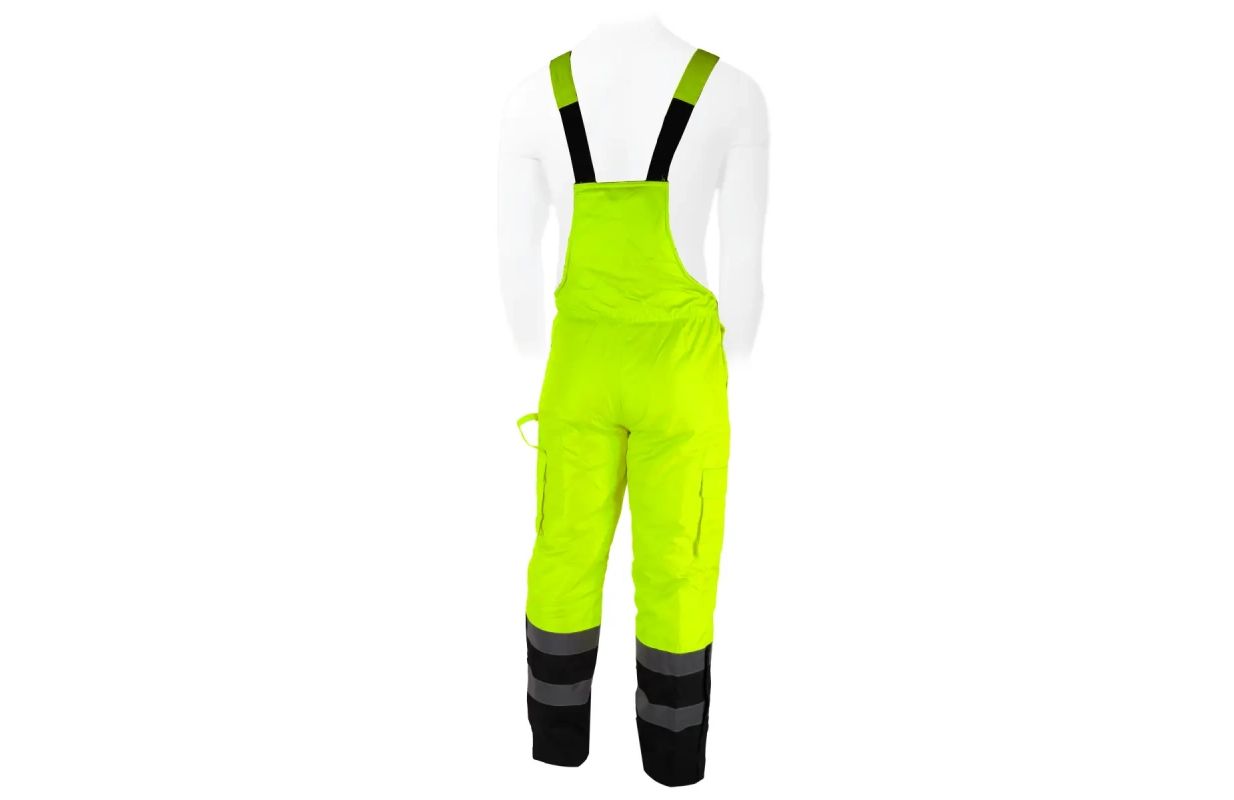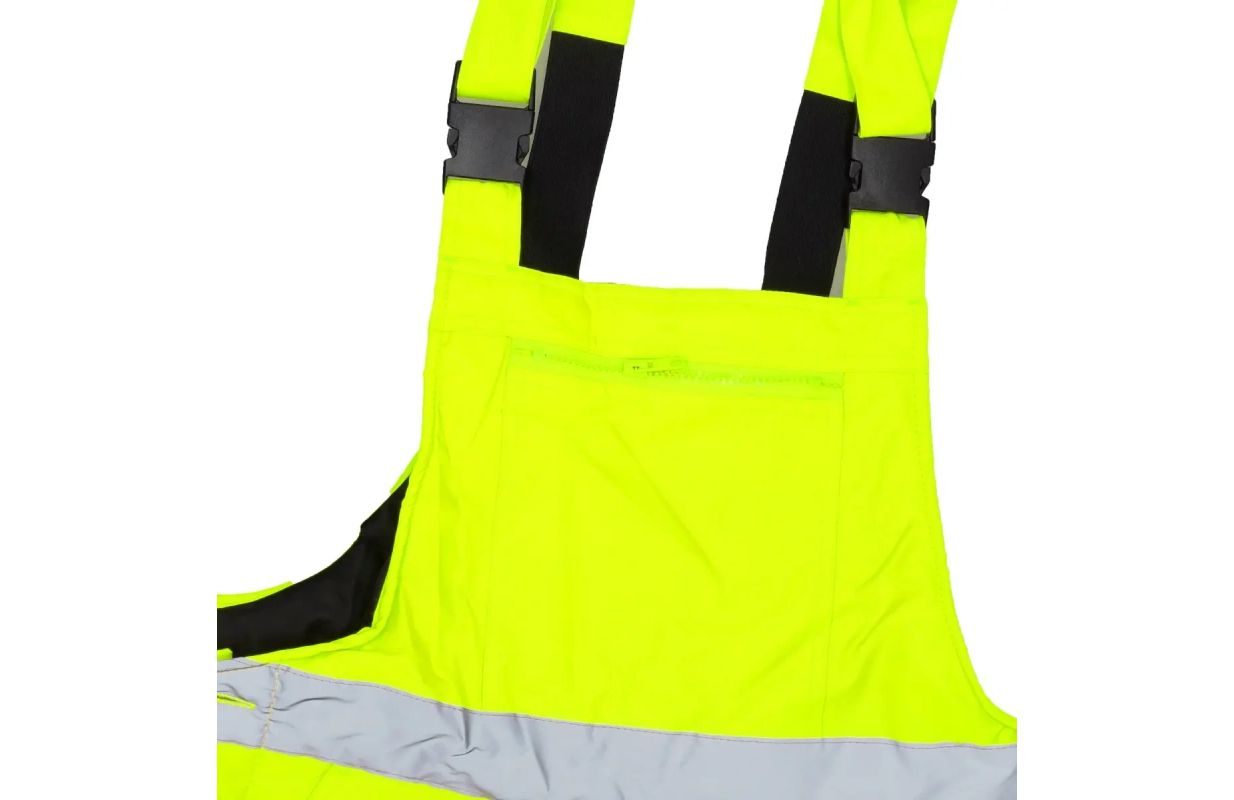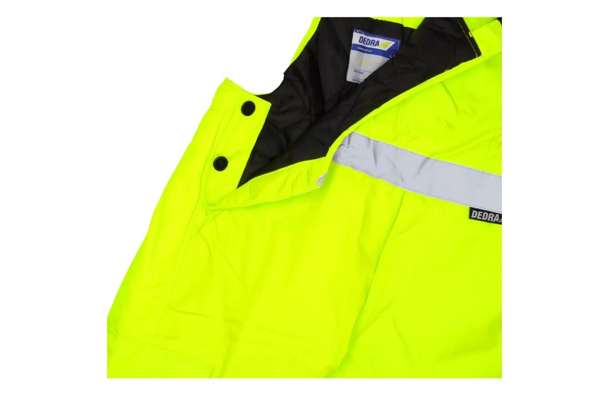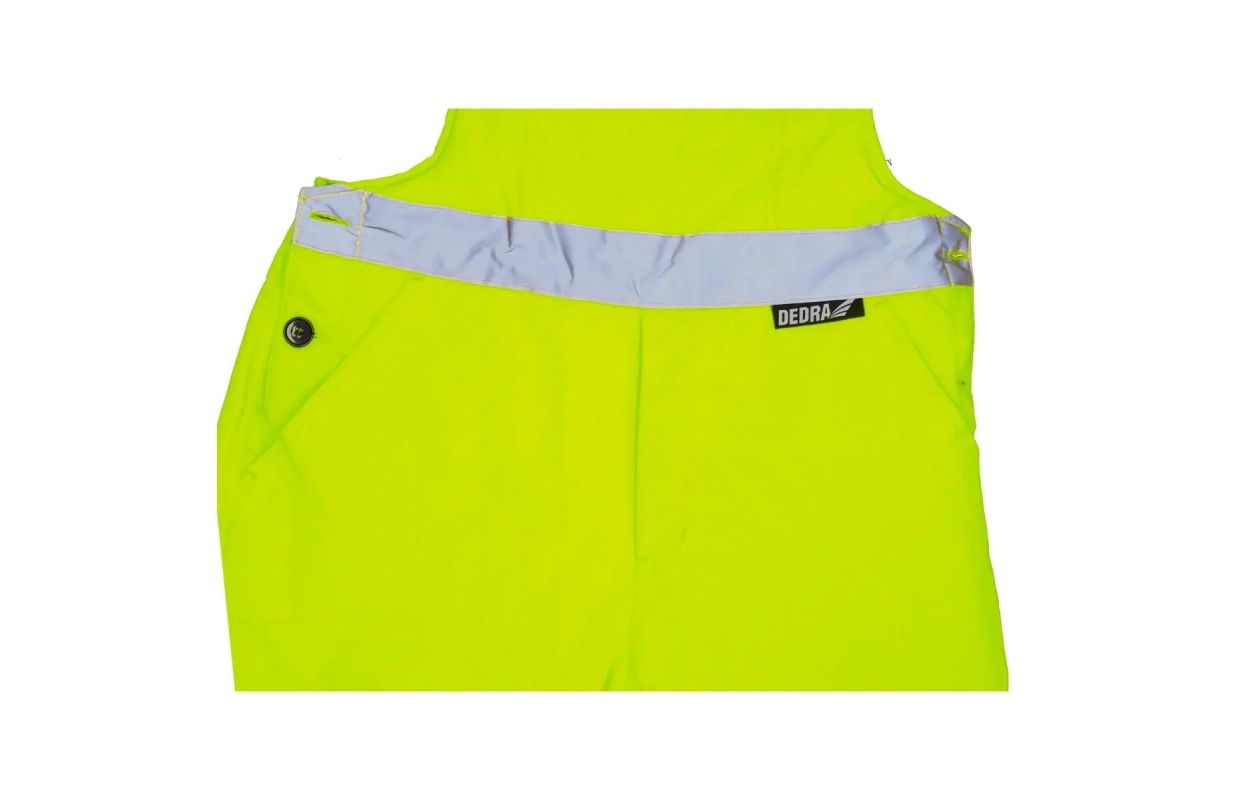 Утепленные светоотражающие полукомбинезоны сшиты из ткани Oxford 300D плотностью 180 гсм. Ткань обеспечивает ветрозащиту и водонепроницаемость до 2000 мм. Кроме того, используются водонепроницаемые швы. Изнутри они имеют стеганую подкладку из полиэстера 180 г/м² и подкладку из тафты. Брюки имеют эластичный пояс и регулируемые лямки с вшитой резинкой. Отстегивающиеся штанины способствуют вентиляции. Практичные и функциональные карманы и петля для молотка. Для обеспечения видимости в сложных условиях или после наступления темноты брюки имеют светоотражающие ленты на ногах и дополнительно на поясе. Ленты имеют термопечать шириной 5 см и сертифицированы CE EN20471. Доступны размеры от S до 3XL.
