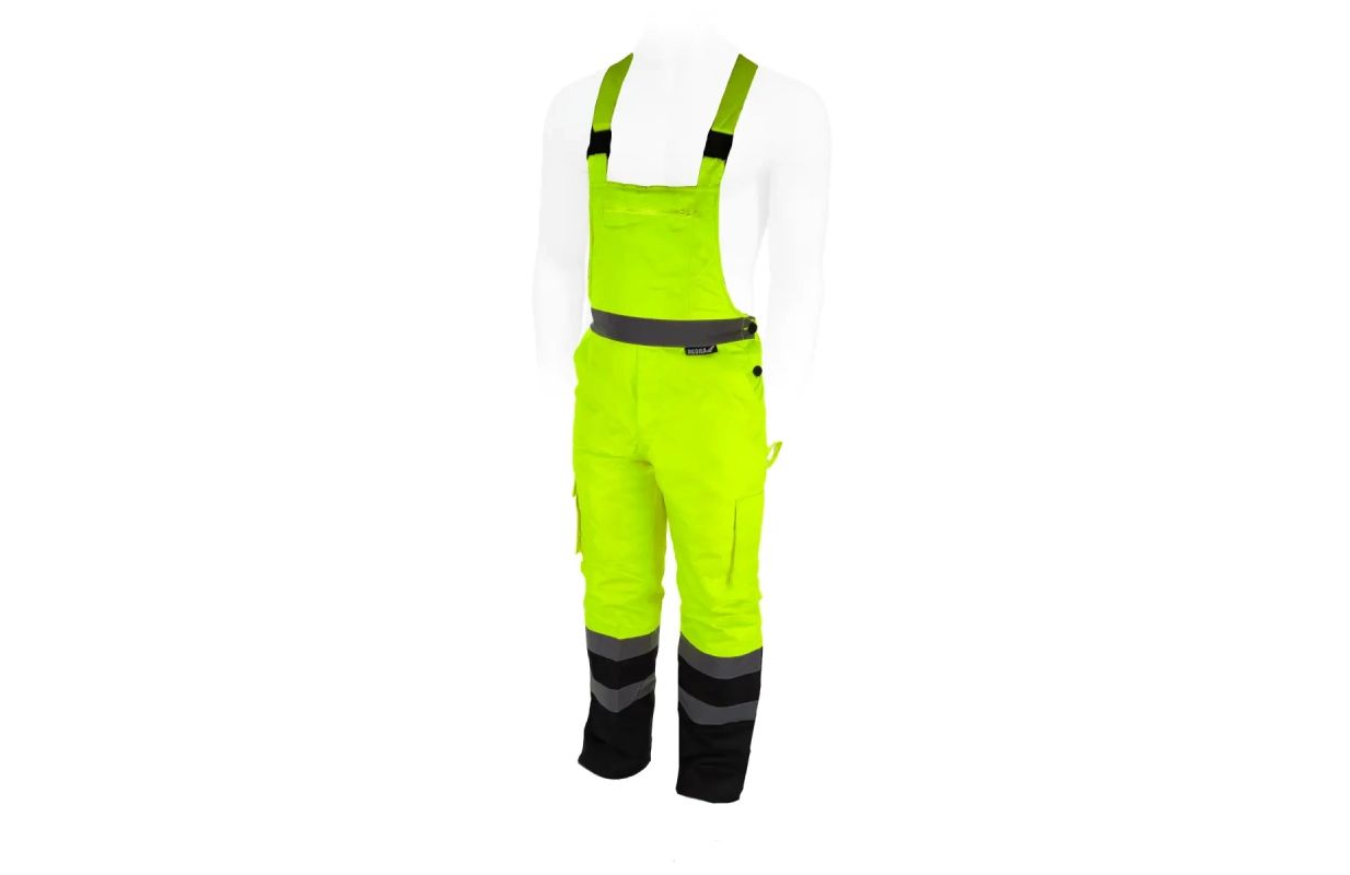 Утепленные светоотражающие полукомбинезоны сшиты из ткани Oxford 300D плотностью 180 гсм. Ткань обеспечивает ветрозащиту и водонепроницаемость до 2000 мм. Кроме того, используются водонепроницаемые швы. Изнутри они имеют стеганую подкладку из полиэстера 180 г/м² и подкладку из тафты. Брюки имеют эластичный пояс и регулируемые лямки с вшитой резинкой. Отстегивающиеся штанины способствуют вентиляции. Практичные и функциональные карманы и петля для молотка. Для обеспечения видимости в сложных условиях или после наступления темноты брюки имеют светоотражающие ленты на ногах и дополнительно на поясе. Ленты имеют термопечать шириной 5 см и сертифицированы CE EN20471. Доступны размеры от S до 3XL.