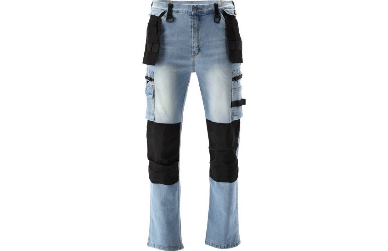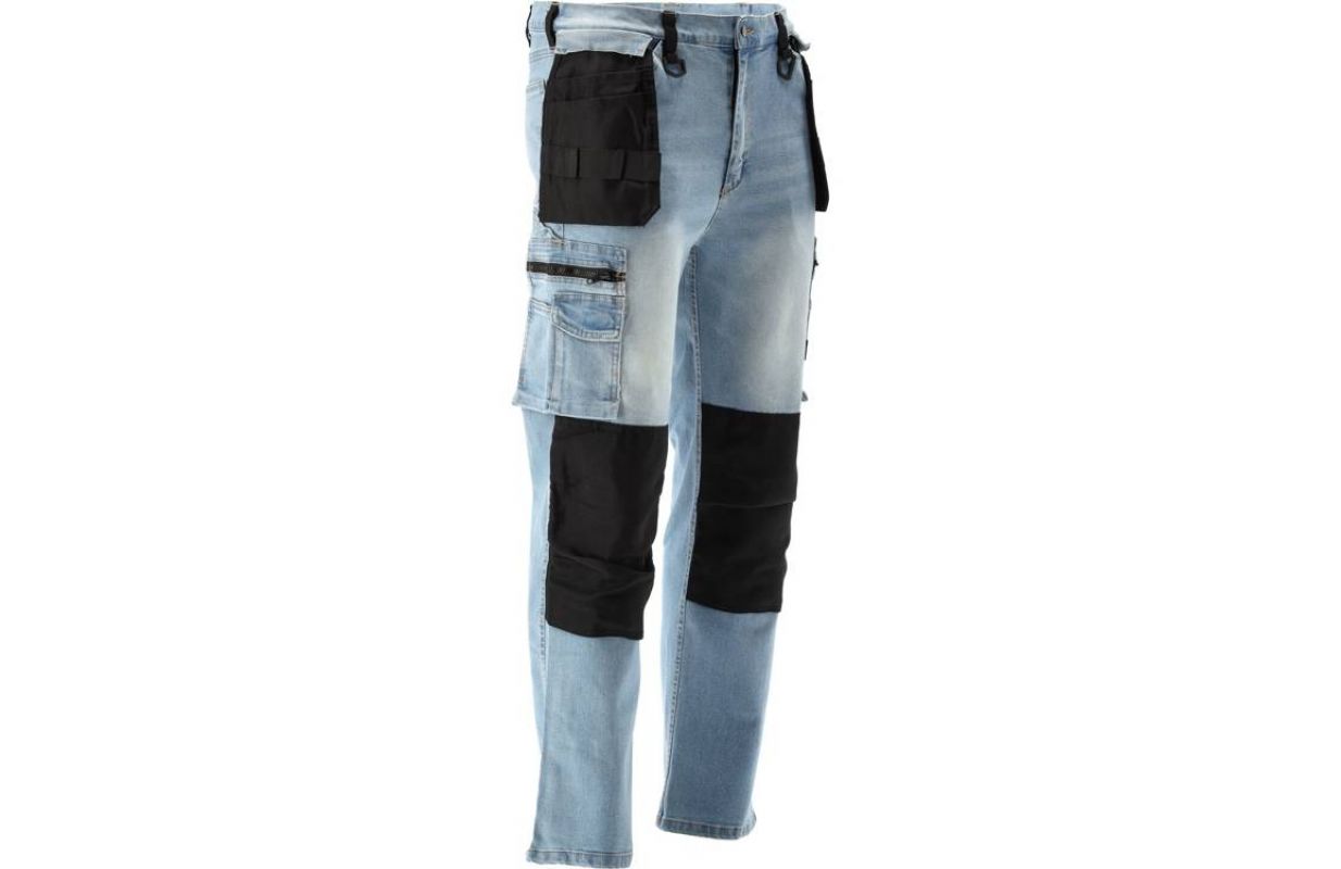 Рабочие брюки облегающего кроя с эластаном из потертого и эластичного денима. Целых семнадцать карманов, в том числе один на липучке, два на молнии и два съемных накладных кармана. Большое количество основных карманов и слесарных карманов из прочного материала поможет организовать работу плотника, кровельщика или сантехника.