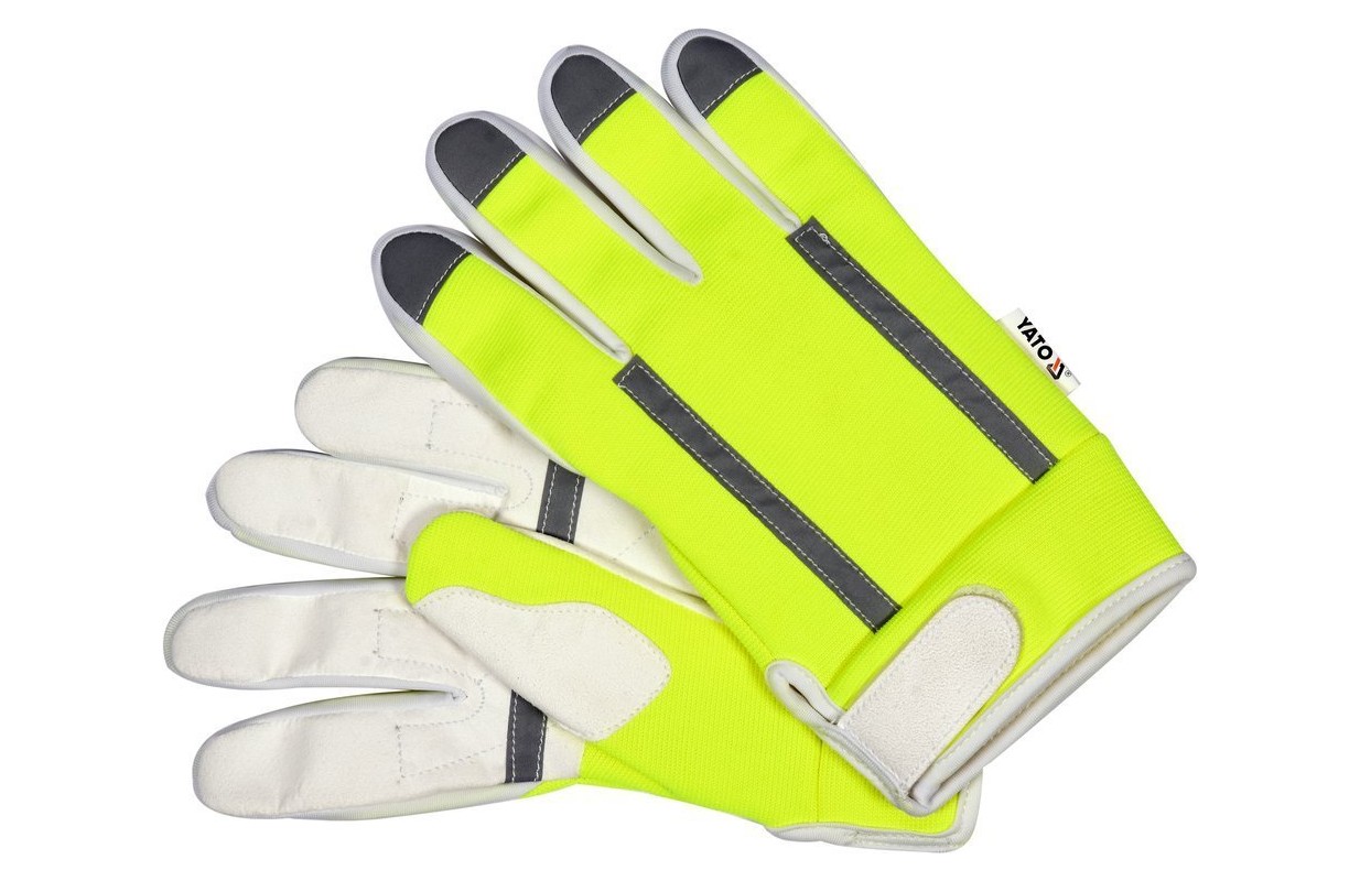 Рабочие перчатки YT-74670 из белой синтетической кожи Amara и плотной синтетической ткани ярко-желтого цвета со светоотражающими элементами.