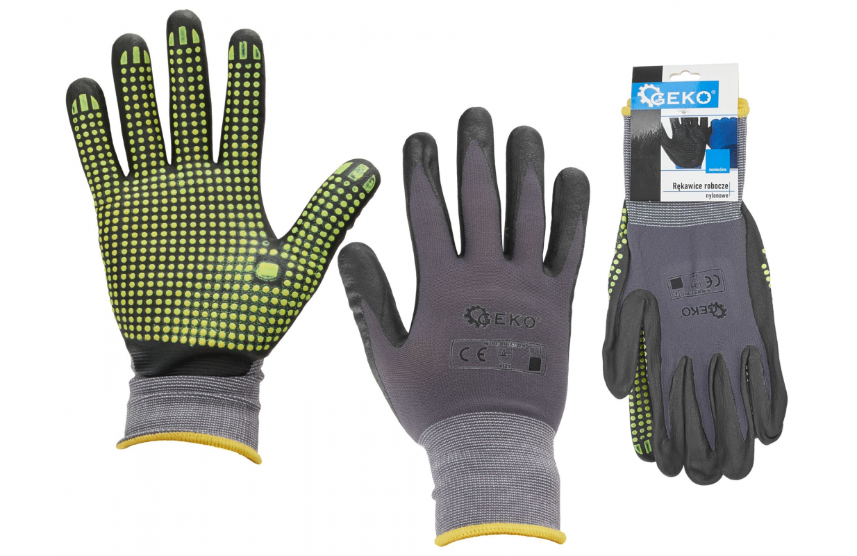 Рабочие перчатки из нейлона с точечным латексом для прочного и надежного захвата. Перчатки эластичные, прочные и очень устойчивые к истиранию и разрывам.