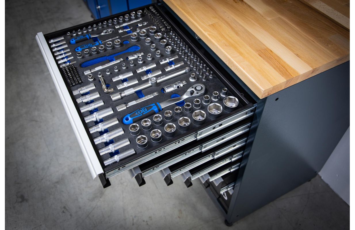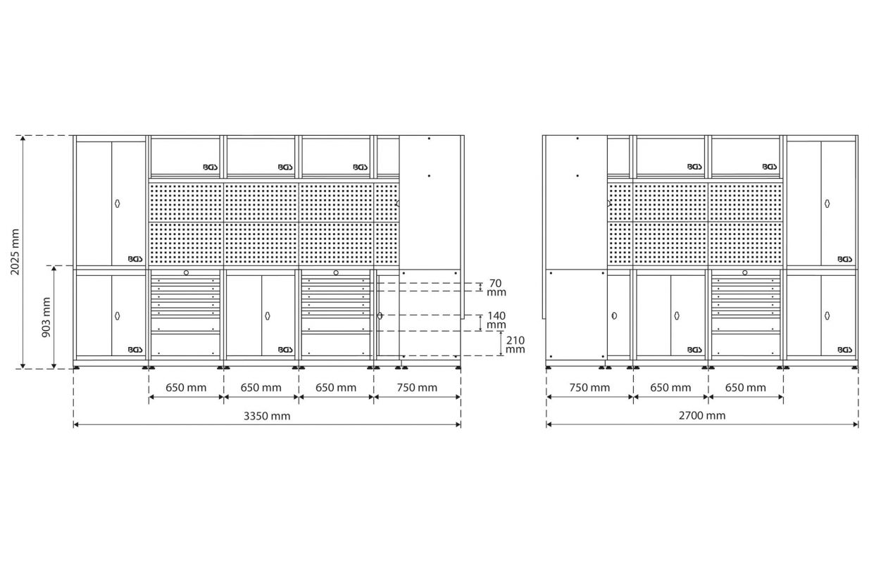 6 навесных шкафов с передней створкой, вместимостью до 30 кг 4 шкафа 2 двери, с 1 полкой, вместимость до 80 кг 2 шкафа для мастерской, 2 двери, с 2 полками, вместимость до 80 кг 1 шкаф для мастерской, 1 дверь, грузоподъемность до 80 кг 3-х напольные шкафы, с 7 плавными выдвижными ящиками с направляющими на шарикоподшипниках, вместимостью до 25 кг (каждый ящик) 14 перфорированных стеновых панелей 3 столешницы из массива дерева, 1950 x 550 x 30 мм, 1300 x 550 x 30 мм, угловая зона, вместимость до 250 кг/м² 20 ключей (по 2 на каждый элемент) Технические данные Вес брутто 625 кг Отделка поверхности Порошковое покрытие Высота ящика 15 x 50,5 | 3 х 120 | 3 x 192 мм Глубина ящика 420 мм Количество ящиков 21 шт. Ширина ящика 590 мм Выдвижной ящик 100%