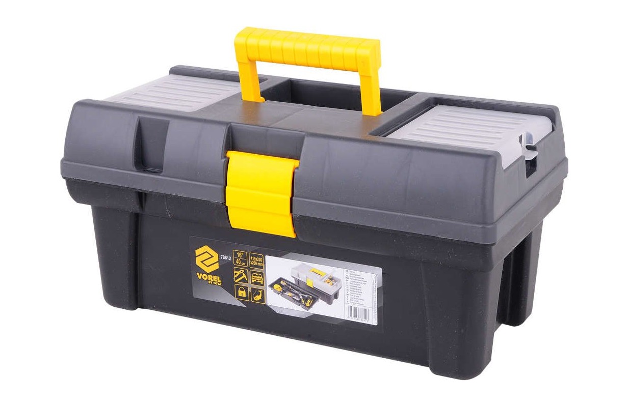 Ящик для инструментов 16" со съемным лотком с держателем бит и дополнительными органайзерами для хранения мелких предметов. Изготовлен из пластика.