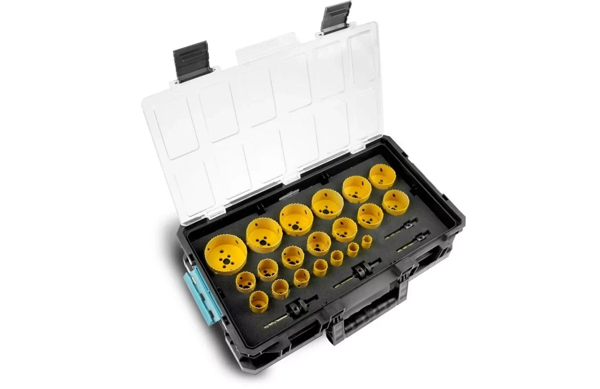 Набор из 20шт биметаллических пил для проделывания отверстий в таких материалах, как металл, нержавеющая сталь, цветные металлы, алюминий, дерево или пластик. Пилы изготовлены из высококачественной быстрорежущей стали HSS. Правильный угол наклона и расстояние между зубьями обеспечивают эффективное и быстрое сверление отверстий. При работе с пилой важно использовать правильную охлаждающую жидкость и адаптировать скорость к материалу, в котором сверлится отверстие.